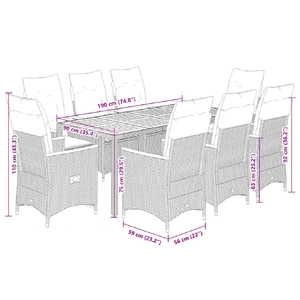 This garden dining set is a great choice for al fresco dining or just relaxing in the garden, backyard, or on the patio. Durable material: PE rattan, also known as poly rattan, is a strong, low-maintenance synthetic material that looks like natural rattan. It's lightweight, easy to clean, and commonly used for outdoor furniture due to its durability and weather-resistant properties.Adjustable backrest and footrest: This garden seat has a handle. You can adjust the backrest and footrest to any position by pulling the handle, and quickly return them to their original positions.Stable and easy-to-clean tabletop: This garden table has an acacia wood top that is sturdy, durable, and easy to clean with a damp cloth.Comfortable seat experience: This outdoor furniture set, complete with thickly padded cushions, offers a comfortable seating experience.Removable and washable cover: These seat cushions feature removable covers for easy washing and maintenance. The back cushions have a flap at the back for easy attachment to the backrests. Good to know:To make sure your outdoor furniture stays beautiful, we recommend protecting it with a waterproof cover.