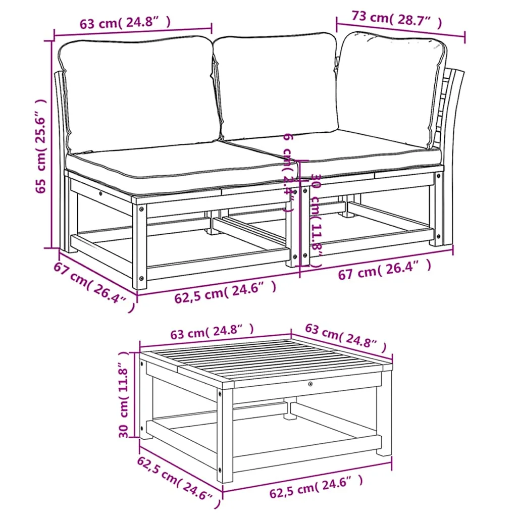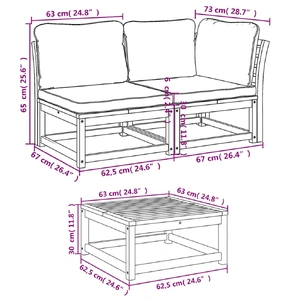 This wooden garden lounge set with cushions has an elegant design and is a great choice for relaxing and enjoying in the garden or patio. Solid acacia wood: Solid acacia wood is a beautiful natural material. Acacia wood is a tropical hardwood, which is dense, sturdy, and durable.Comfortable seat experience: The backrest and the thickly-padded cushions make the garden sofa set more comfortable to sit on.Slatted design: The slatted design of the wooden lounge set effectively prevents water from pooling, ensuring that the seat remains dry and free from potential rot.Modular design: This outdoor furniture set has a modular design, making it completely flexible and easy to move around, so you can create a customised outdoor furniture arrangement. Good to know:To make sure your outdoor furniture stays beautiful, we recommend protecting it with a waterproof cover.
