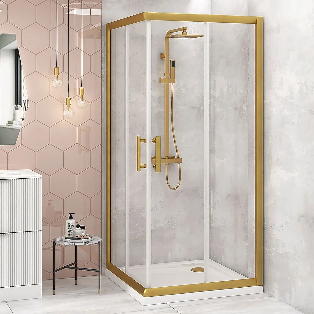 Fashioned from top-tier 6mm safety glass, this sophisticated shower door is the perfect choice if your looking for a gold bathroom aesthetic or remodeling endeavour.