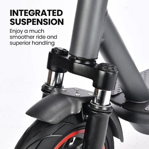 The scooter's design is ideal for adults and teens alike, featuring a long deck for enhanced control. The 10-inch airless tyres, significantly larger than competitors', work seamlessly with the ActivShok front suspension system to ensure a smooth ride over any bumps.