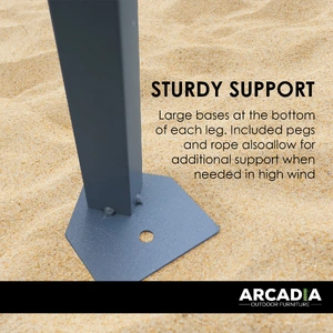 Each post is independent height adjustable to compensate for uneven ground and has large flat feet plates with peg holes to secure the gazebo during windy periods.