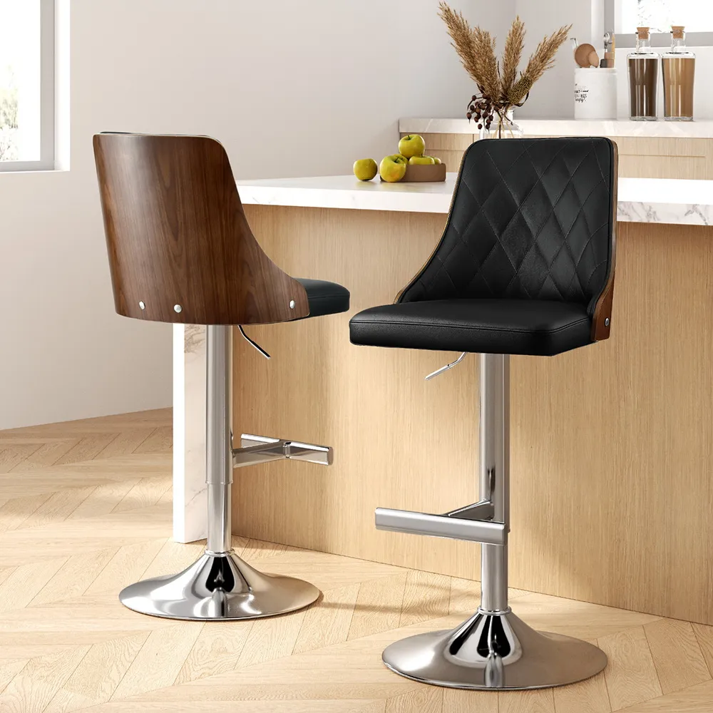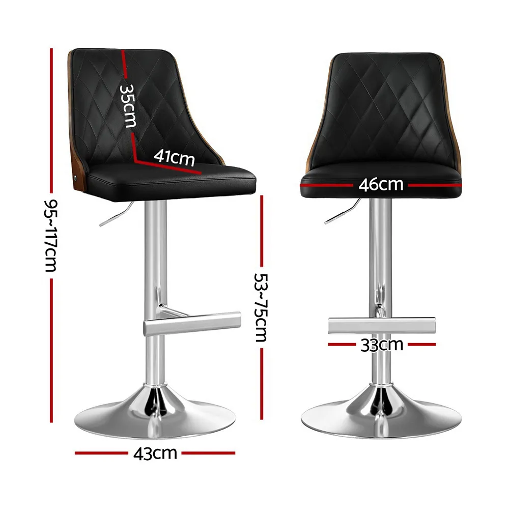 Upgrade your space with Artiss Bar Stools Set of 2. Featuring tool-free height adjustment (95-117cm), these stools combine premium black leather seats with elegant bentwood backrests. The reinforced gas lift cylinder and T-shape footrest ensure stability, while anti-slip protectors safeguard floors. Supports 150kg per stool. Easy assembly for instant use.