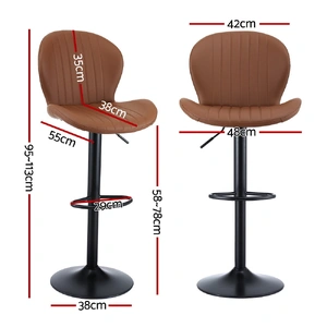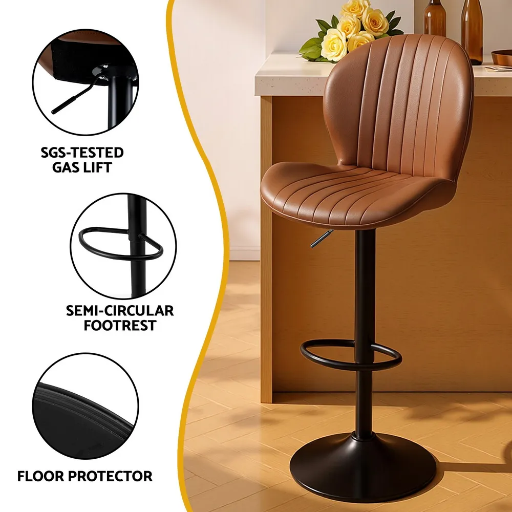 This set of 4 premium bar stools combines modern aesthetics with practical features. Upholstered in brown PU leather, the contoured shell-shaped seats with a vertical stripe pattern offer both comfort and style. The adjustable height (95–113cm) makes these stools versatile for various counter or bar setups. Built with a sturdy metal frame, reinforced gas lift cylinder, and 120kg weight capacity per stool, they are designed for durability and stability. Anti-slip floor protectors and a semi-circular footrest ensure safety and comfort, while easy assembly saves you time. Perfect for kitchens, dining areas, or commercial spaces, these stools are a must-have for any modern interior.