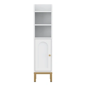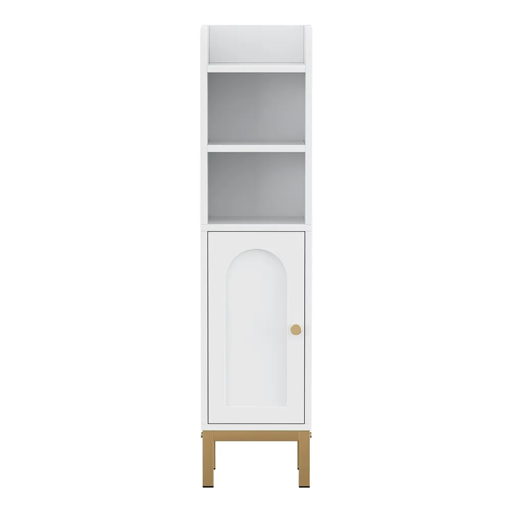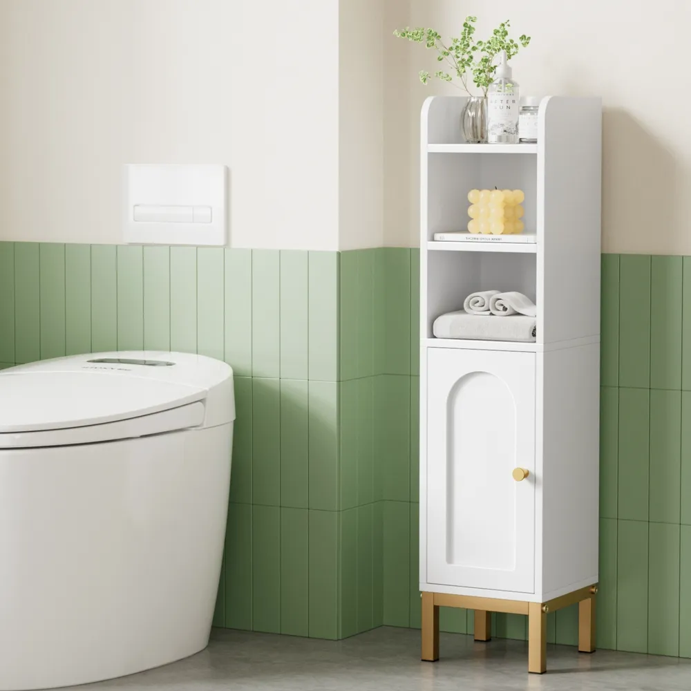 Elevate your bathroom organization with this ultra-slim storage cabinet, expertly crafted to maximize space in narrow Australian homes. Measuring just 20x20x84cm, its space-saving profile tucks seamlessly beside toilets or vanities while the elegant arched door and gold-toned legs add boutique charm. Enjoy versatile 3-tier storage: display potted plants on the open top shelf, adjust the middle compartment for toiletries of any height, and conceal spare toilet rolls in the enclosed bottom cabinet. Built from MDF with reinforced metal legs and an included anti-tip safety kit. Effortless tool-free assembly makes this durable, family-friendly organizer perfect for rentals or compact spaces—transforming clutter into curated style with uncompromising functionality.