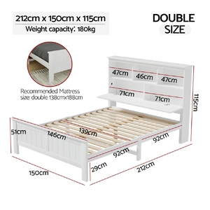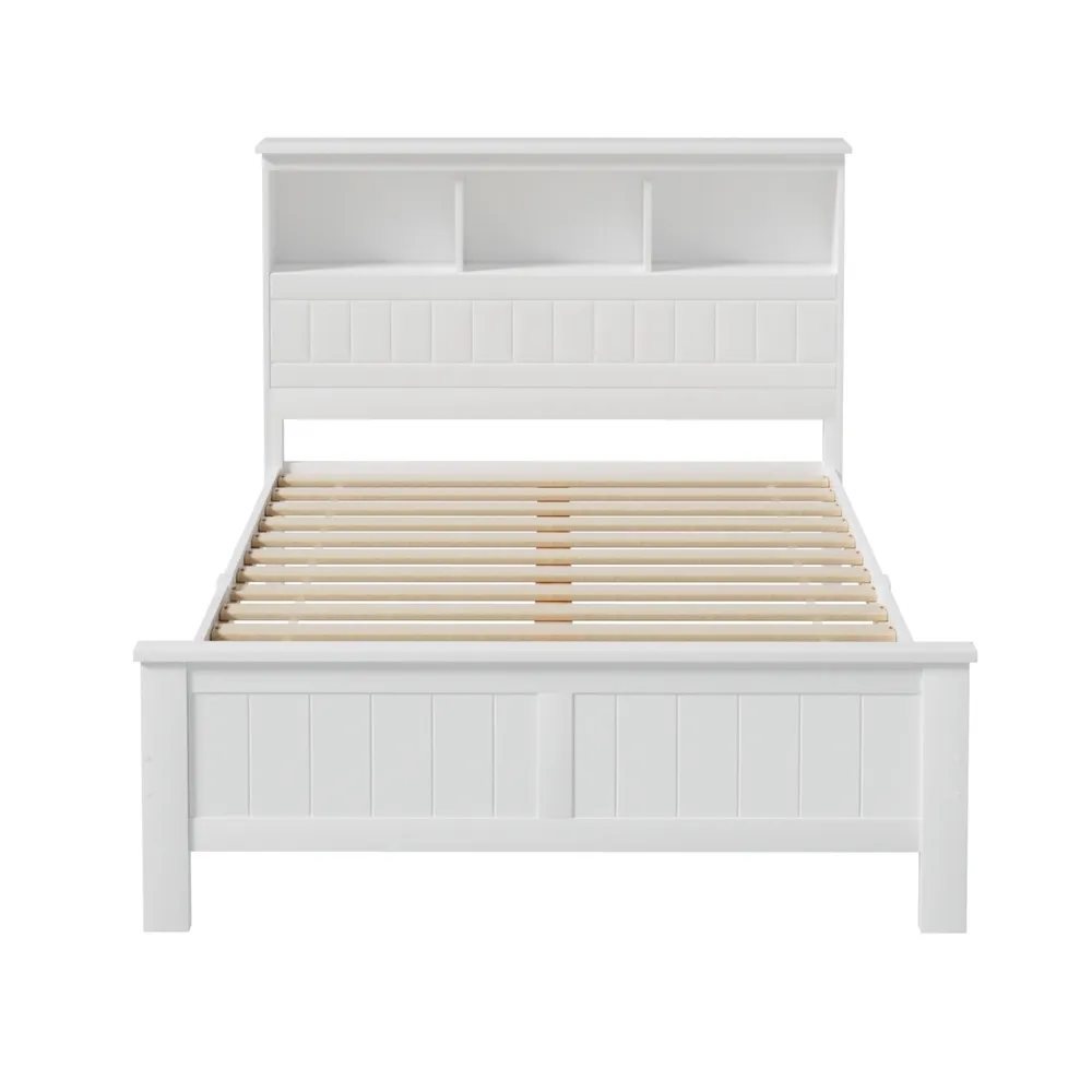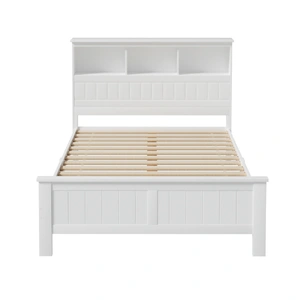 Made of natural pine wood, the Artiss Conqueror Bed Frame is ideal for kids as it for any adult. Strong and sturdy, the bed frame comes with a solid plywood slated base, reinforced supports across the frame, heavy-duty steel fixings and smooth edges all round. Finished in a non-toxic, eco-friendly white paint, the neutral coloured bed frame is also very practical with ample storage from a headboard that comprises three open compartments and a closed shelf that folds down as well as more room beneath the bed frame for optional trundle drawers or any storage boxes. Fact it, this charming bed frame is designed to please in more ways than one.