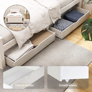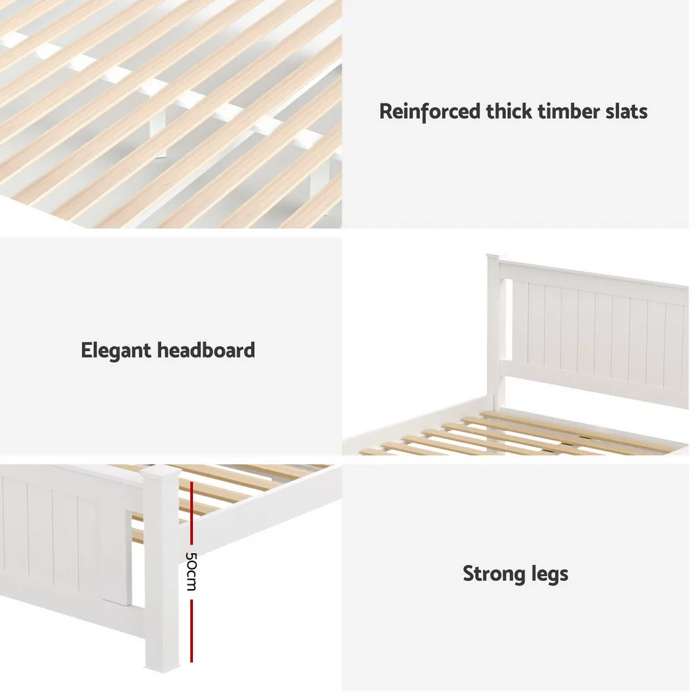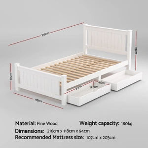 Made of natural pine wood, the Rio bed frame is ideal for your kids as it for any adult. Strong and sturdy, the bed frame comes with a solid timber slated base, stylish headboard, heavy duty steel fixings and smooth edges all round. Finished in a non-toxic, eco-friendly white paint, the neutral coloured bed frame makes for easy d��cor coordination with any bedroom. So, the next time you need a durable and contemporary bed frame that has quality written all over it, make it a Rio bed frame from ozplaza.living. We make living great.The bed frame with two storage drawers provides additional space for storing bedding essentials.