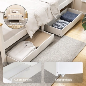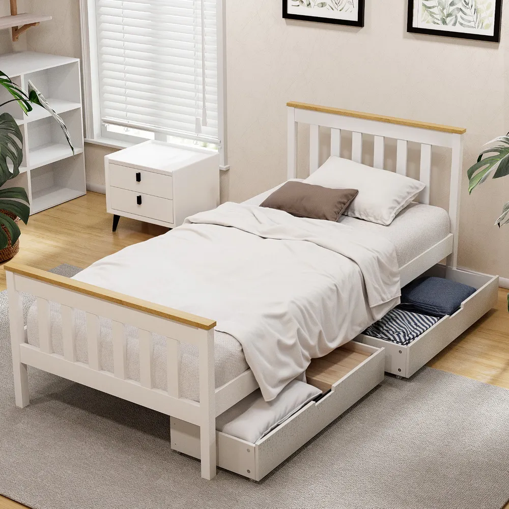 Featuring an exclusive classic design, our Pony Wooden Bed Frame is all about total simplicity with absolute practicality. Constructed of solid pine wood, the bed frame features quality plywood slats smooth finished edges, heavy-duty steel fixings and reinforced bracket support across the frame that cheaper alternatives do not provide. Not least, the two-tone colour adds an elegant and stylish look that will go well with any adult or children use.The bed frame with two storage drawers provides additional space for storing bedding essentials.