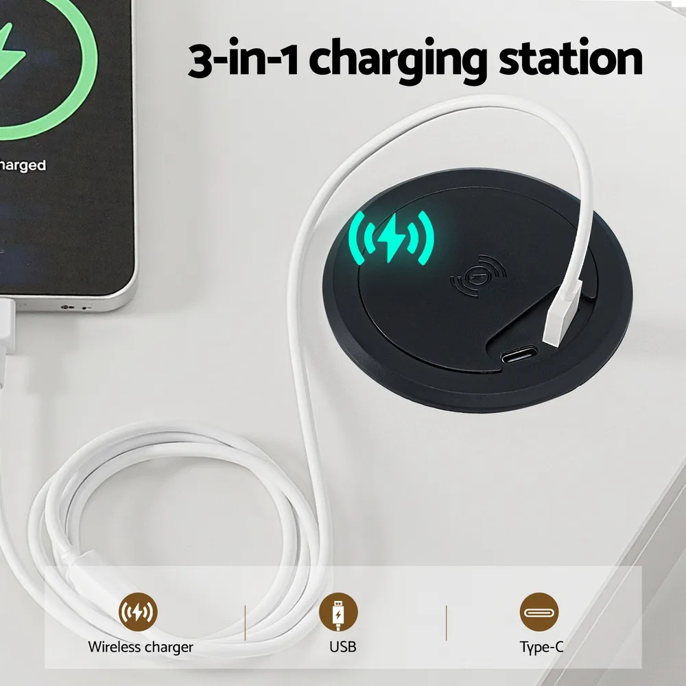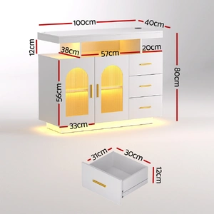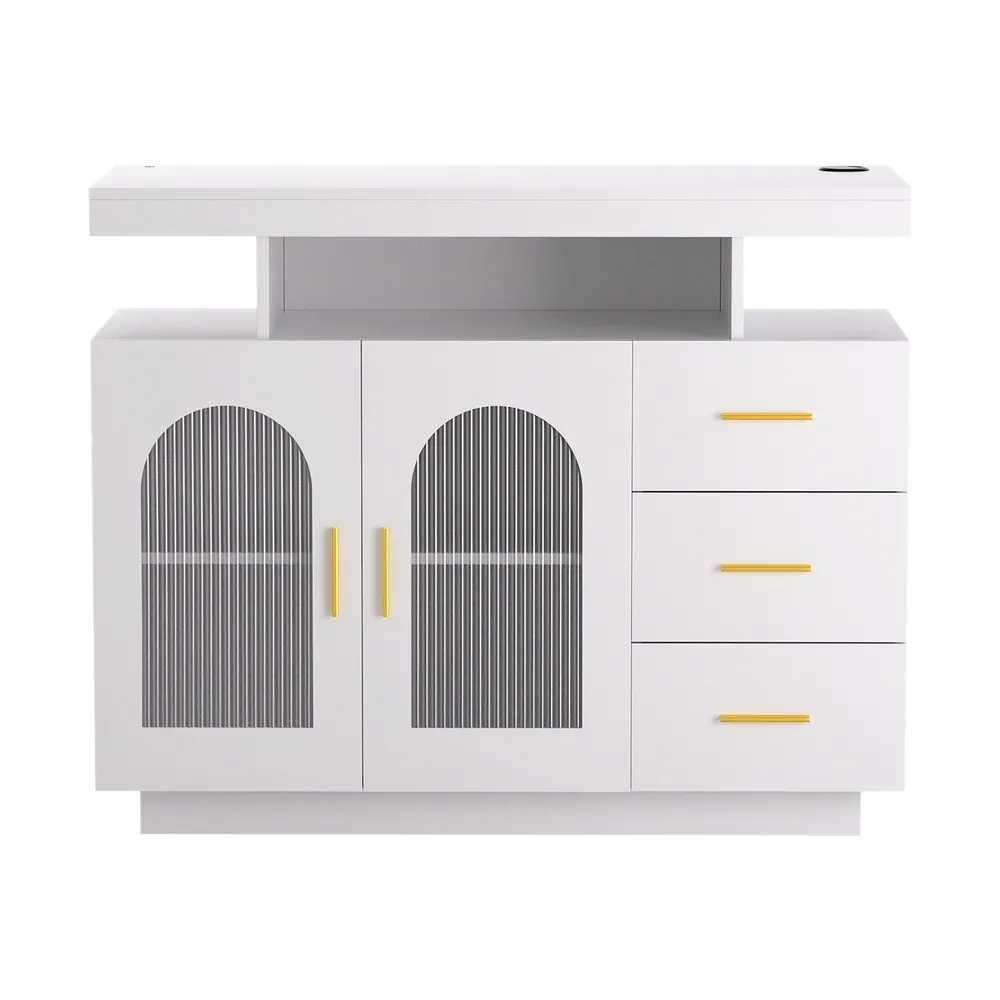 Upgrade your home with this versatile buffet cabinet, designed for both style and functionality. With spacious tabletop, 3 open compartments, 3 drawers, and a 2-door cabinet, it offers ample storage for any space. The adjustable warm LED lighting adds a modern touch, while the 3-in-1 charging port (wireless, USB, Type-C) ensures convenience. Crafted from durable E1 particle board, it features a matt surface, elegant gold handles, and transparent arched acrylic doors. An anti-tip kit guarantees safety, and it's easy to assemble, clean, and maintain. Elevate any room with this sleek and practical storage solution!