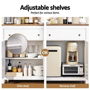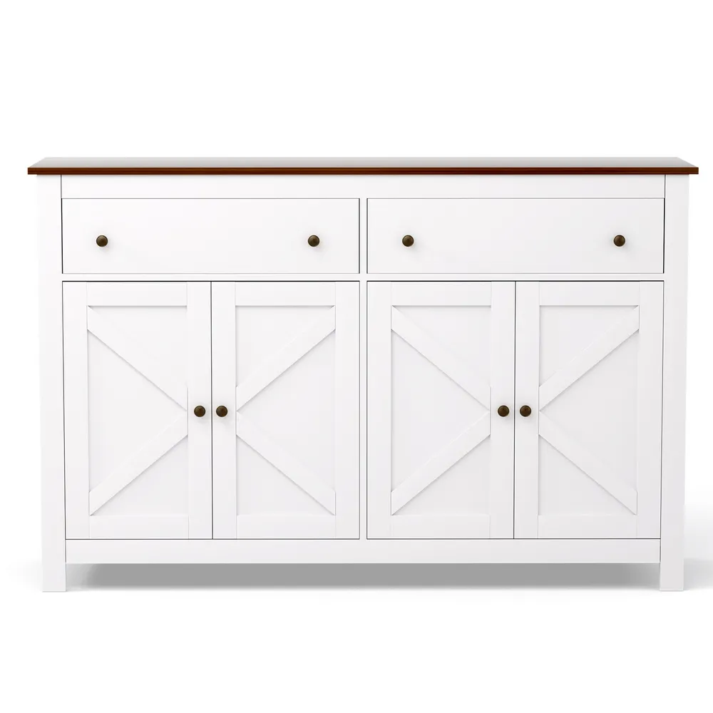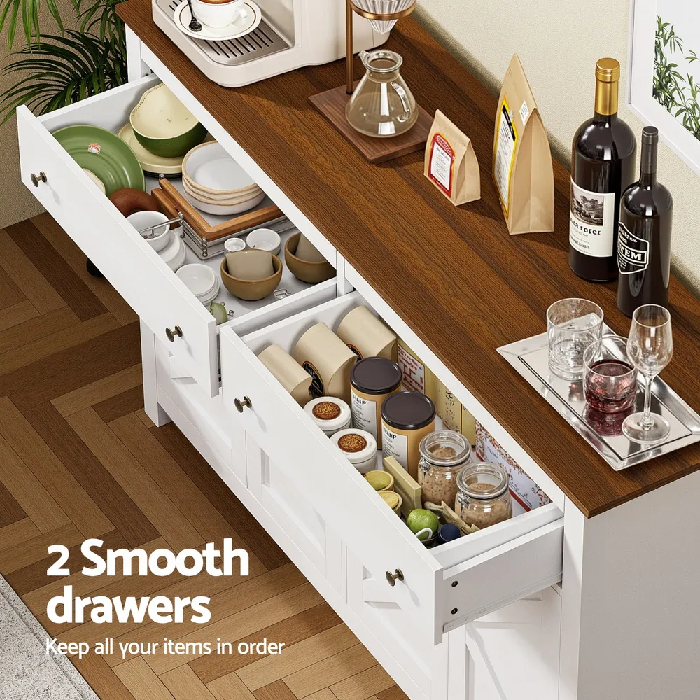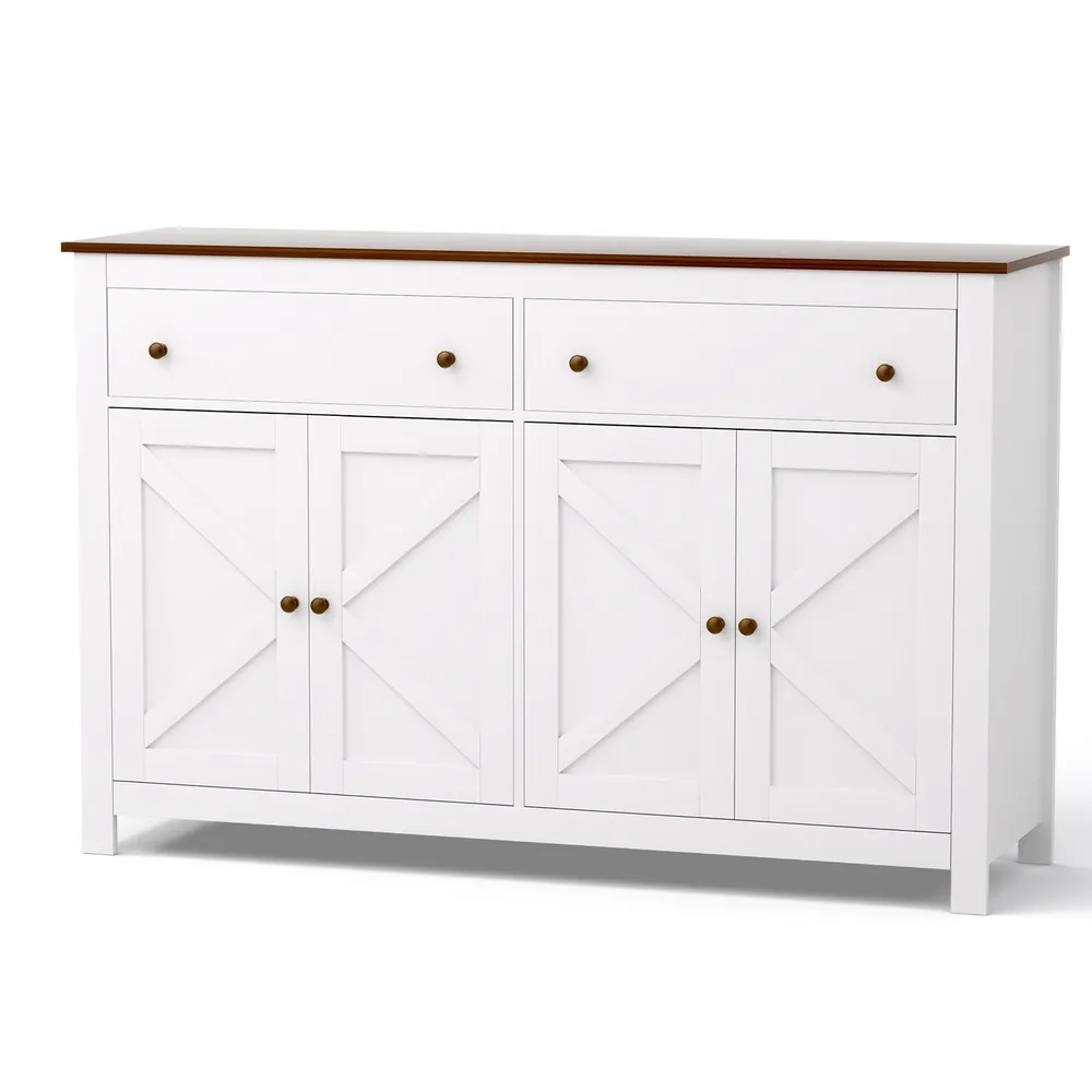 Elevate your home storage with this elegant buffet sideboard. he unique X-frame door design adds a modern aesthetic, while the two spacious cabinets and drawers provide ample room for your dining essentials, books, or decor. Featuring height-adjustable shelves, you can easily customise the space according to your requirements. Silent soft-closing door hinges ensure smooth, noise-free operation, enhancing durability. Built with a sturdy particle board frame and exquisite metal handles, this sideboard is made to last. The anti-tip kit ensures safety, making it perfect for families. Easy to assemble and fits seamlessly in dining rooms, living rooms, or kitchens. Upgrade your space today with this functional and stylish storage solution!