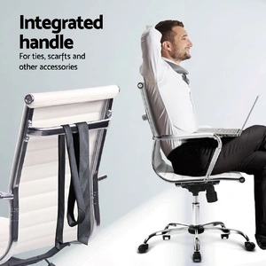 Paired with the desk is an office chair full of iconic styling, the office chair is absolutely sleek and elegant in every profile. More so with its faux leather upholstery that offers sophistication and class. Better still, the seat is rotatable 360° to face any direction with ease. It also comes with both height and tilt adjustment to allow you to be seated at your most comfortable position and posture. Thoughtful touches such as a chrome-finished rack at the back of the chair allows for hanging of ties, scarfs and other fashion accessories. Not least, the similar chrome adorned base has five wheel castors for easy movement.