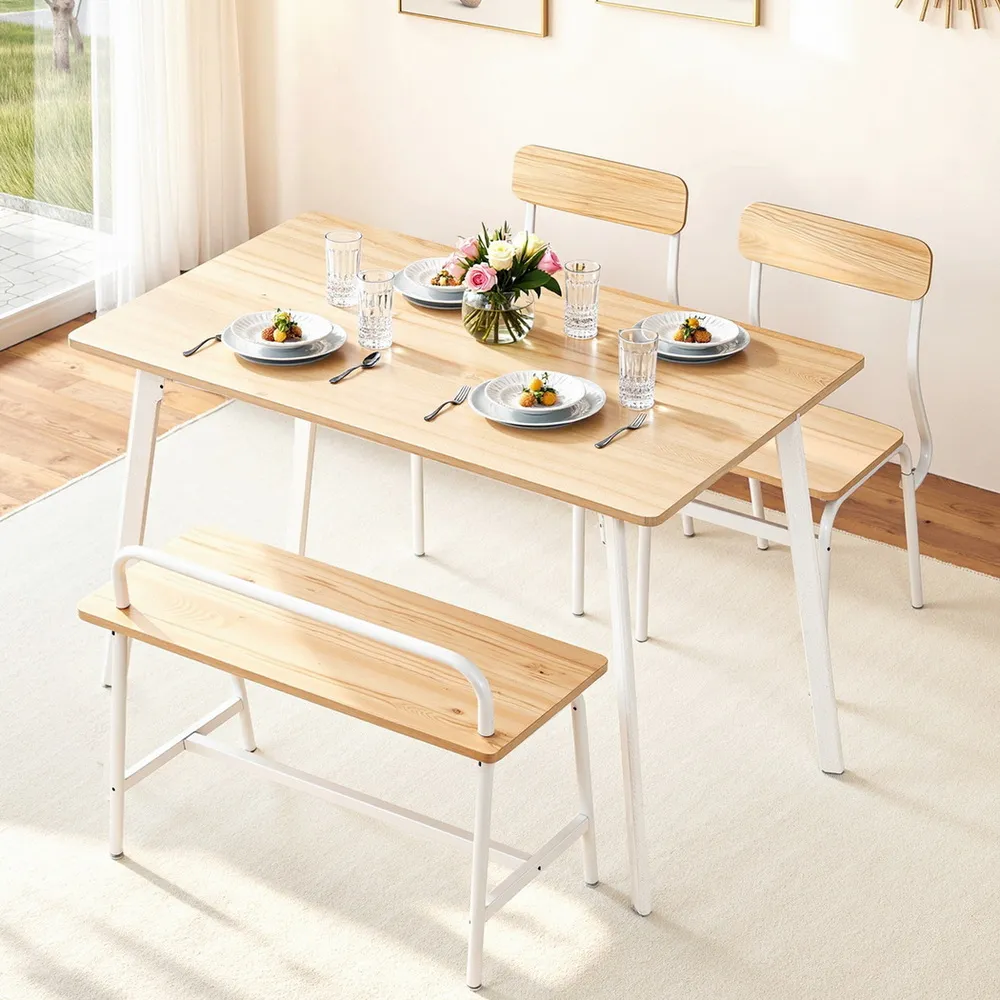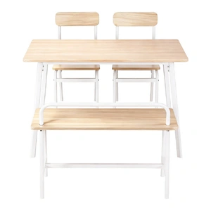 The set includes a spacious tabletop, two stable chairs, and a comfortable bench, making it easy to seat four people. The aesthetic features a fresh, modern combination of a Natural wood-look surface and a clean White powder-coated metal frame for that trendy Scandi or minimalist style.