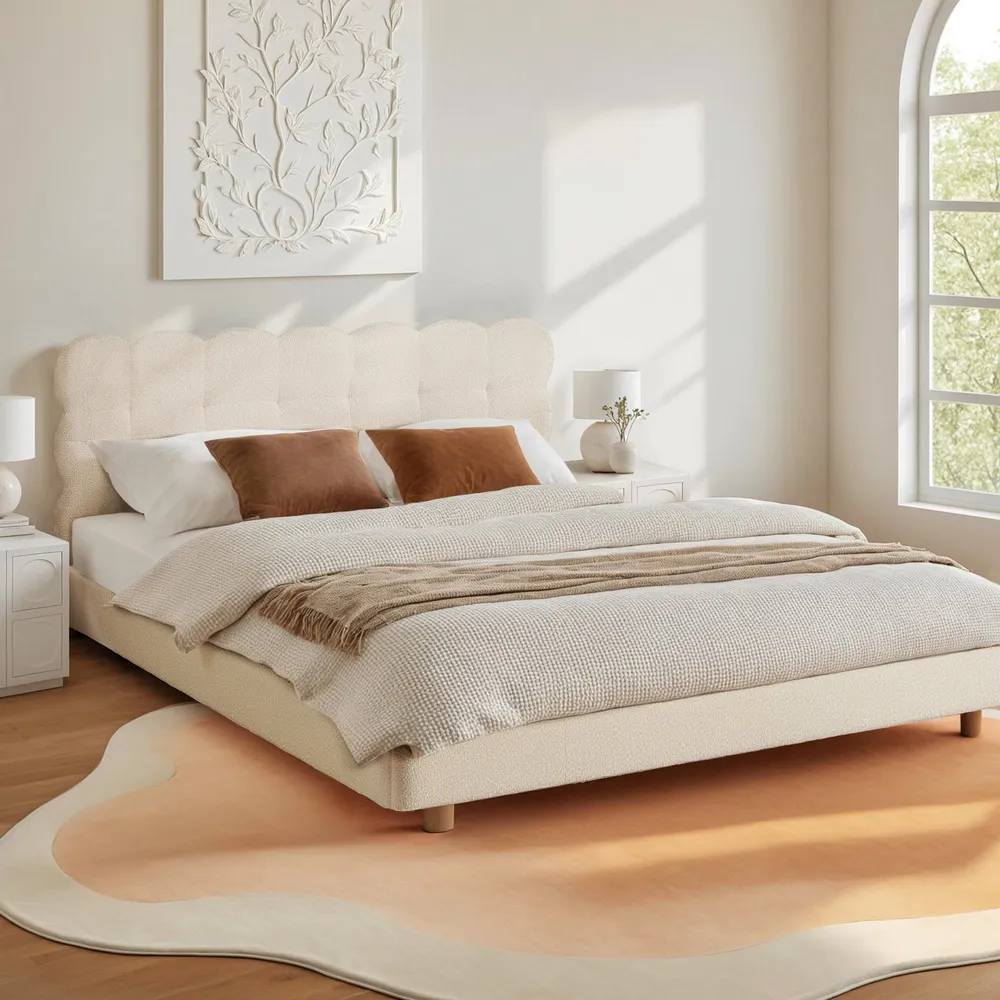Artiss cloud headboard bed frame in white. Features boucle fabric upholstery and durable wood and metal construction. This platform base fits double mattresses. Includes wooden slats and metal legs for strength. Easy to assemble. Supports up to 300KG. Note: Actual colour may vary.