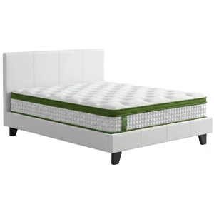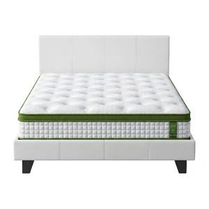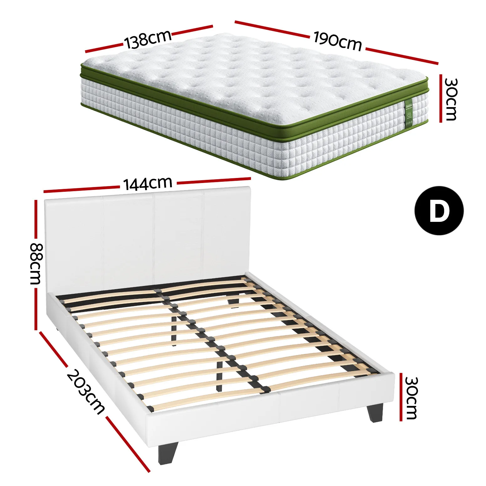 Artiss Double Bed Frame combines white PVC leather platform with hybrid mattress. Features modern bedhead, reinforced wood frame, and arched slats. Included mattress offers pocket coils for motion isolation and medium firm support. Simple assembly with mattress-in-a-box delivery. Backed by 10-year warranty. Fits standard double mattresses.