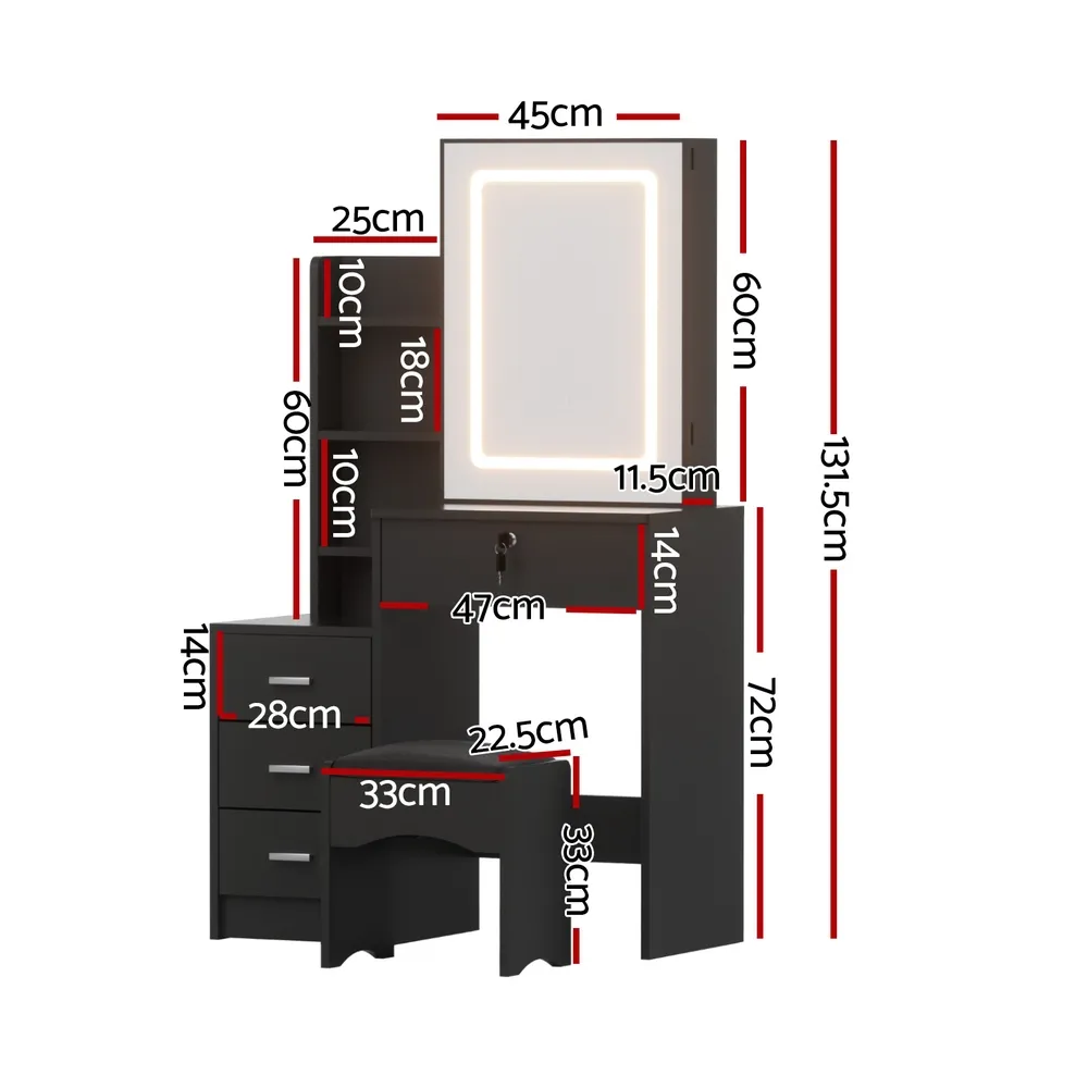 The Artiss LED Dressing Table is the ultimate blend of style and functionality. Featuring a sliding mirror door with hidden storage and 3 adjustable LED lighting options, this vanity table ensures perfect lighting for makeup application. Its 4 spacious drawers, including a lockable one, offer ample space to keep your beauty essentials organised. The foam-padded stool adds comfort, while the durable, easy-to-clean design ensures longevity. Ideal for bedrooms, apartments, or professional use, this modern vanity is a must-have for beauty enthusiasts.