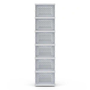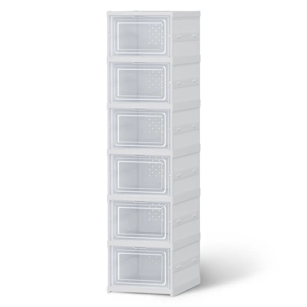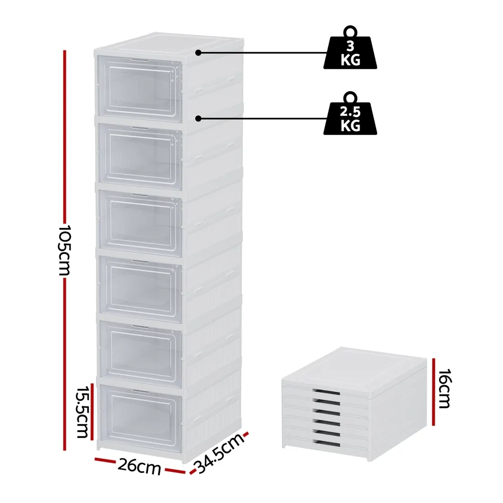 Maximise your space with this versatile Artiss shoe rack! Crafted from durable PP plastic, this 6-tier organiser offers clever shoe storage for entryways, cloakrooms, or garages. The innovative foldable design features a one-piece frame for quick setup, breathable back flaps, and see-through doors with raised handles for easy access. Each compartment holds up to 2.5KG, providing practical shoe box storage without sacrificing style. Perfect for small homes! Dimensions: 25.5x34.5x105cm. White. Assembly required (1 package).