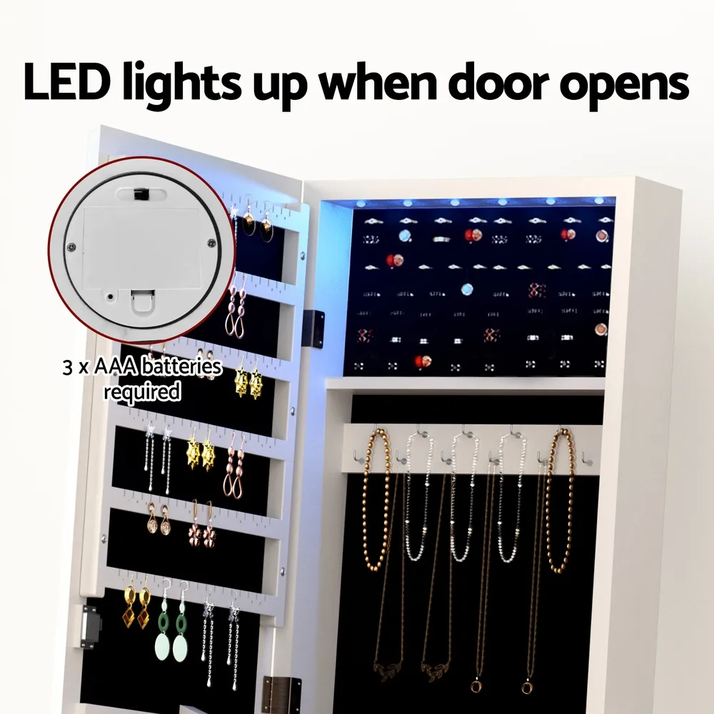Discover the ultimate Artiss Jewellery Cabinet: crafted from sturdy MDF with ample storage, LED-lit interior, full-length mirror, soft flocking lining, and easy assembly. Ideal for organising and showcasing your collection elegantly.