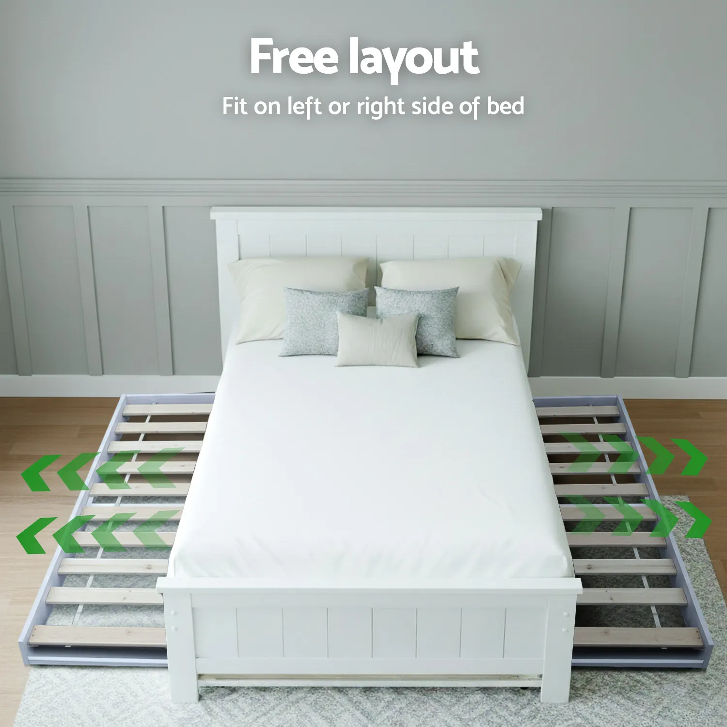 Artiss Trundle Bed: Say goodbye to space constraints with this innovative trundle bed. Perfect for homes that are always bustling with friends and family, the trundle bed conveniently stores underneath the main bed when not in use. When guests arrive, simply slide it out to reveal an extra sleeping space that's ready for use. Crafted from solid pine wood and equipped with quality timber slats, this bed frame ensures even weight distribution, offering a sturdy and reliable sleeping solution. Designed to fit standard Australian king single-sized mattresses, it guarantees minimal hassle during setup.