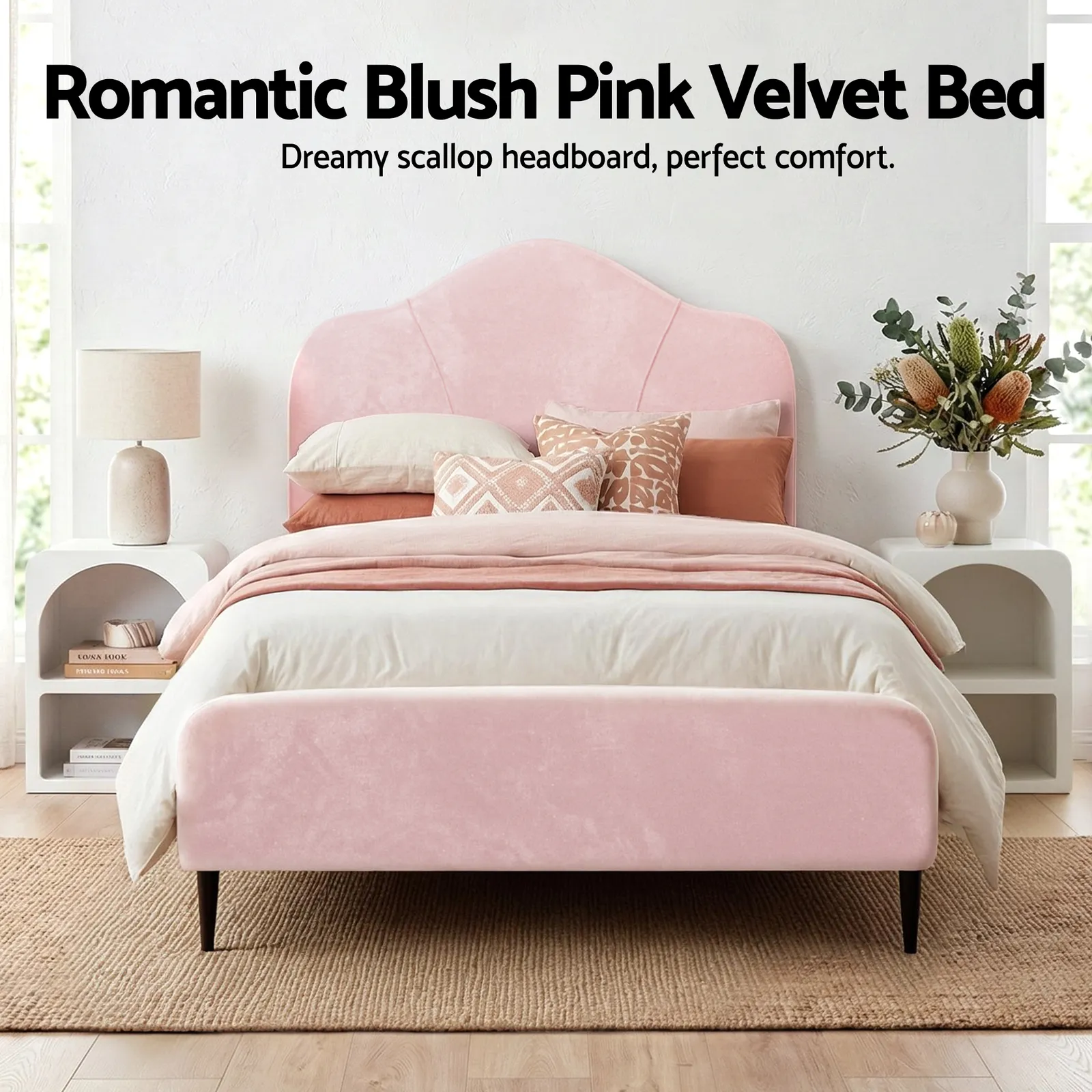 This Artiss King Single Bed Frame features velvet upholstery, storage space, and a plush headboard. Includes a white bedside table with textured E1 MDF shelves (10kg per shelf). Sturdy wooden/metal construction supports 180kg. Easy assembly. Fits standard King Single mattresses (107x203cm). Dimensions: bed 214x118x123cm, table 40x31x55cm.