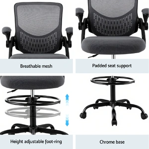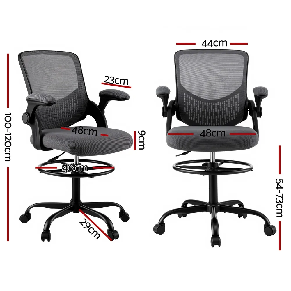 Upgrade your workspace with the Artiss Mesh Drafting Office Chair, designed for both comfort and functionality. The breathable mesh backrest promotes airflow, keeping you cool throughout the day, while its contoured design provides essential support for your back. Flip-up armrests offer flexibility, allowing you to slide the chair under your desk with ease. The height-adjustable seat and footrest ring ensure personalised comfort, making it suitable for various desk heights. With a 360-degree swivel and a stylish chromed base, this chair is both practical and modern—perfect for any home or office setup.