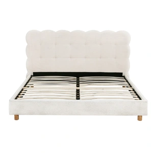 Artiss cloud headboard bed frame in white. Features boucle fabric upholstery and durable wood and metal construction. This platform base fits queen mattresses. Includes wooden slats and metal legs for strength. Easy to assemble. Supports up to 300KG. Note: Actual colour may vary.