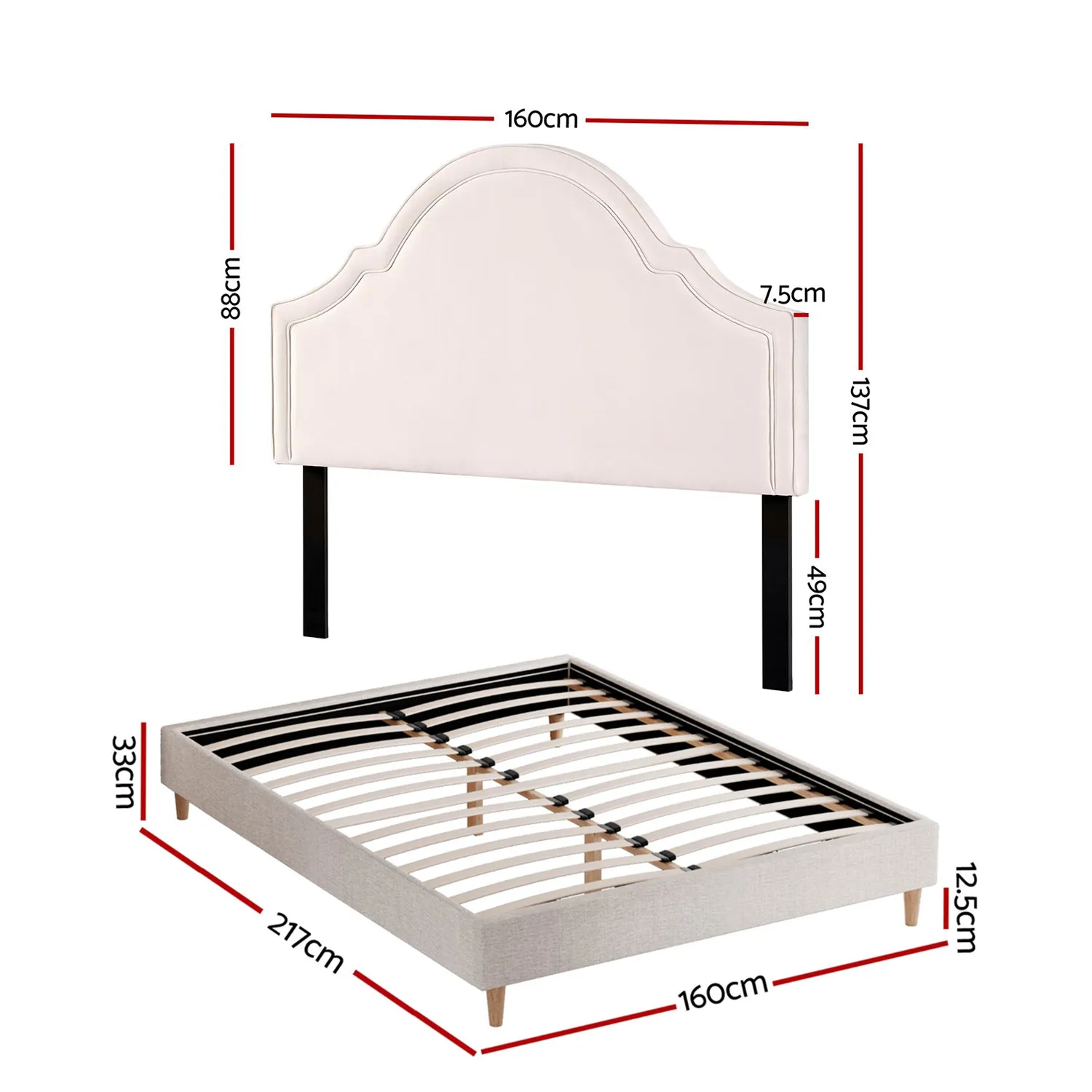 Upgrade your bedroom with the Artiss Queen Bed Frame Set. This upholstered storage bed frame combines faux linen fabric and sturdy wooden slats, offering both style and function. The matching headboard features a scalloped velvet design on a wood-plastic composite base. Ideal for queen mattresses (153x203cm), this beige set includes under-bed storage and heavy-duty connectors for lasting stability. Supports up to 300kg. Modern, practical, and ready to assemble.