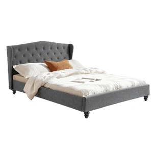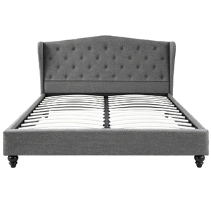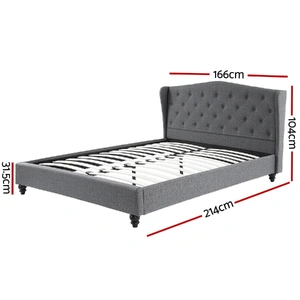 This Artiss Queen Bed Frame combines a wingback headboard with grey linen upholstery and high-density foam padding. Features a sturdy steel frame with reinforced bars, heavy-duty connectors, and a wooden slat base. Includes adjustable centre support. Fits standard Queen mattresses (203x153cm). Modern design for bedrooms. Overall dimensions: 214x166x104cm.