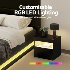 Elevate your sleep space with the Artiss Double Bed Frame and matching LED Bedside Table. Featuring 16 dynamic RGB colours across both pieces, this PVC leather set combines mood lighting innovation with robust storage solutions. The plush foam-padded headboard and gas-lift base offer premium comfort, while UV high-gloss finishes create a sleek centrepiece for modern bedrooms.