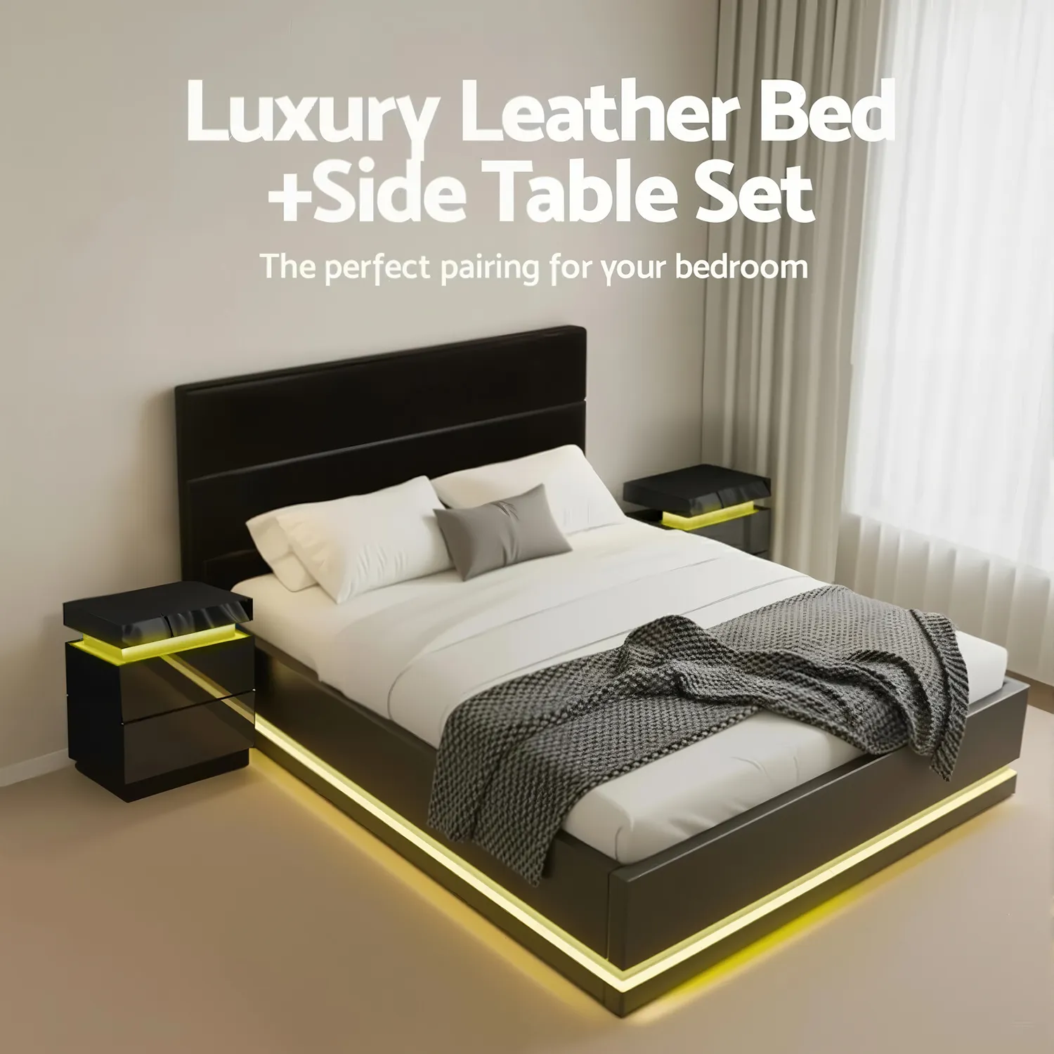 Elevate your sleep space with the Artiss Double Bed Frame and matching Two LED Bedside Tables. Featuring 16 dynamic RGB colours across both pieces, this PVC leather set combines mood lighting innovation with robust storage solutions. The plush foam-padded headboard and gas-lift base offer premium comfort, while UV high-gloss finishes create a sleek centrepiece for modern bedrooms.