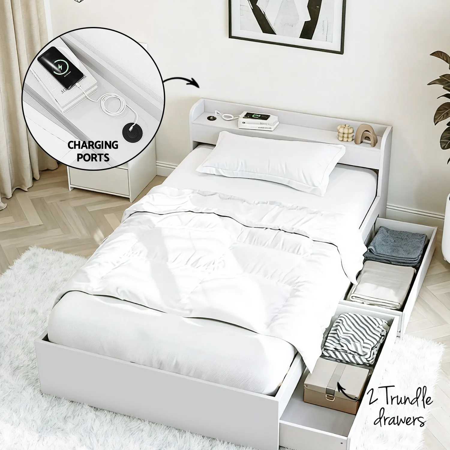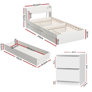 Experience unparalleled comfort with the Artiss Aura Bed Frame. Crafted from thick 15mm and 18mm particleboard, along with 12mm plywood slats, this bed frame is designed for durability and long-lasting use. The robust construction provides complete support and noise-free operation, ensuring a restful sleep. With a multifunctional design, it features two drawers on smooth castor wheels that can be positioned on either side for convenient storage of your bedroom essentials. The headboard, designed with smooth edges, offers ample space for your nighttime necessities, while two USB charging ports with a 200cm cable keep your devices powered overnight. Enjoy the perfect blend of style and practicality with the Aura Bed Frame.
