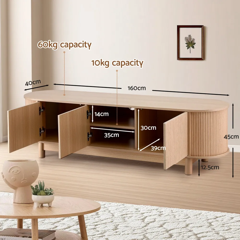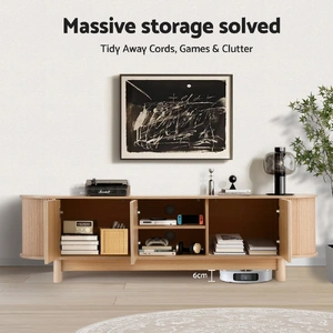 Keep your living room organised and looking sharp with this Artiss entertainment unit. It features 2 storage side cabinet flanking 2 tiers of middle shelves, perfect for media gear, consoles, books, or decor. Crafted from E1 15mm PB with a durable melamine finish, its sturdy construction offers a high weight capacity (tabletop holds 60kg, shelves 10kg each). Safety is covered with safe rounded corners and an included anti-tip kit. Enjoy smooth operation with push-to-open devices and soft close hinges on the cabinet. Solid wood feet with foot pads ensure stability on timber floors. A discreet cable management hole helps keep cords organised.