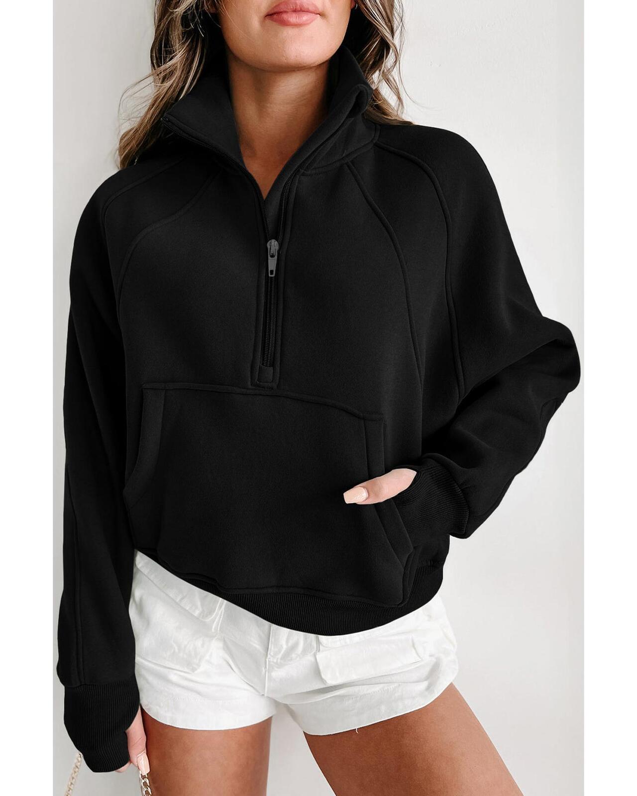 - Black Zip Up Stand Collar Ribbed Thumbhole Sleeve Sweatshirt