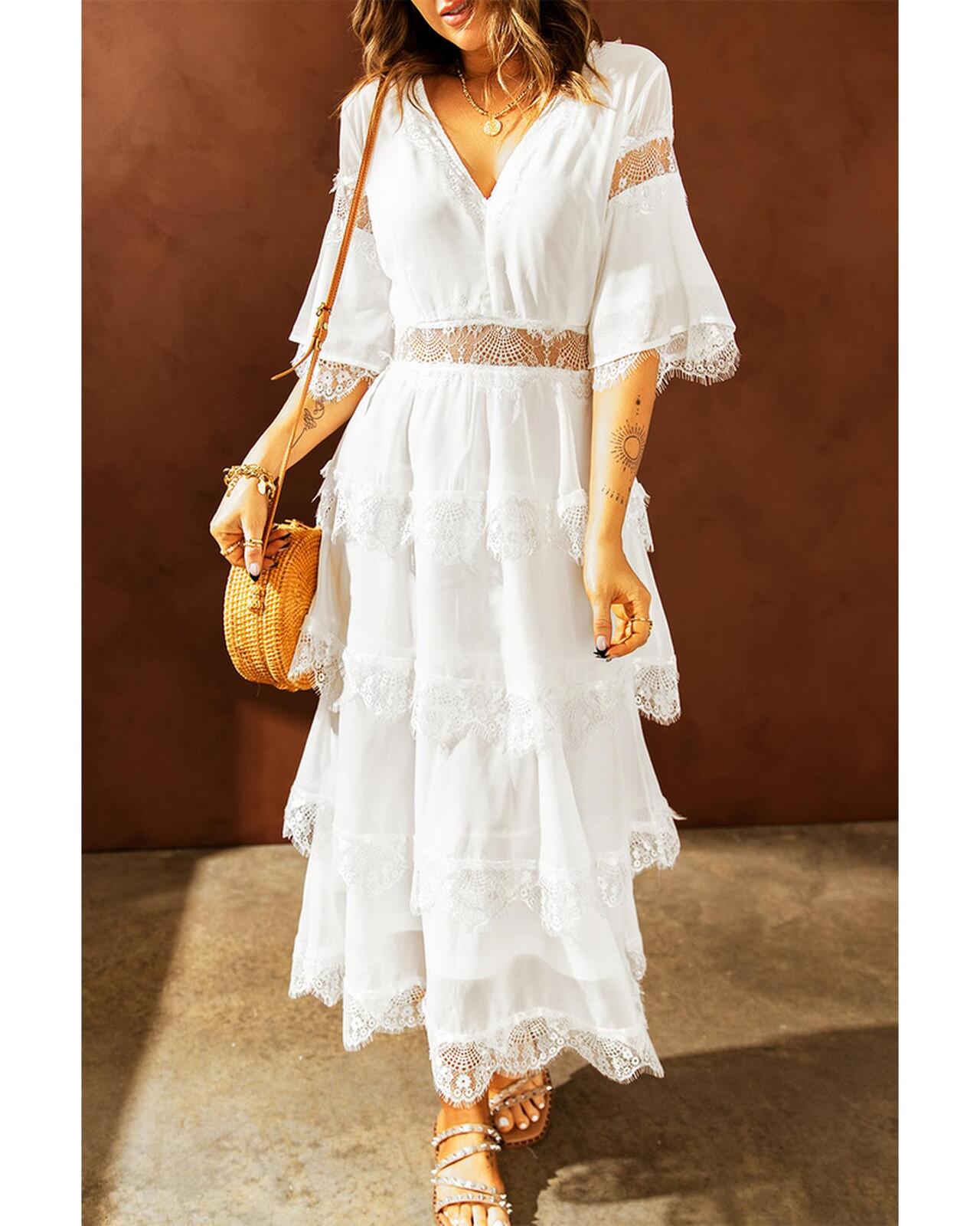 $57.90- Swiss Dot Print See-through Lace Patch Layered Long Dress