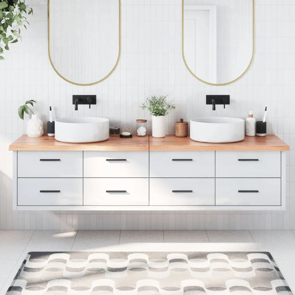 Are you planning to renovate your countertops at home? This wooden bathroom countertop is a perfect choice! Durable construction: This bathroom worktop is made of solid oak wood, which is a beautiful natural material. Oak wood has a medium brown colour and a dense grain, contributing to its unique look. Due to the hinge design, it can be folded and stored in narrow spaces.Versatile applications: Besides a bathroom vanity top, this wooden countertop can be combined with different bases according to your needs. It can be used as a shelf, cabinet top, desk top, table top etc.Treated surface: The bathroom top has been varnished so it is ready for use as an additional finish is not required.Handmade with live edge: This bathroom vanity countertop is handmade with a live edge. Due to that the knots, cracks, slightly curved shapes, and colour tones are part of the oak wood, every piece of oak countertop has its own unique character to display. The delivery is random. Good to know:As a natural product, wood may show knots and imperfections that we fill with black fillings to ensure a smooth appearance.