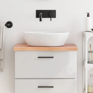 Are you planning to renovate your countertops at home? This wooden bathroom countertop is a perfect choice! Durable construction: This bathroom worktop is made of solid oak wood, which is a beautiful natural material. Oak wood has a medium brown colour and a dense grain, contributing to its unique look.Versatile applications: Besides a bathroom vanity top, this wooden countertop can be combined with different bases according to your needs. It can be used as a shelf, cabinet top, desk top, table top etc.Treated surface: The bathroom top has been varnished so it is ready for use as an additional finish is not required.Handmade with live edge: This bathroom vanity countertop is handmade with a live edge. Due to that the knots, cracks, slightly curved shapes, and colour tones are part of the oak wood, every piece of oak countertop has its own unique character to display. The delivery is random. Good to know:As a natural product, wood may show knots and imperfections that we fill with black fillings to ensure a smooth appearance.
