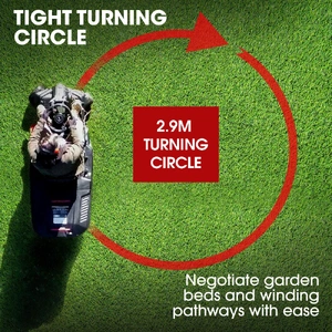 With a compact design that can easily fit through a standard gate and a turning circle of 2.9m, this small sit on lawn mower is agile and navigates tight corners with ease. The 10' front wheels and 13' rear wheels provide a comfortable and manoeuvrable experience. The bagging handle on top, and a nylon grass collection box make maintenance and cleanup a breeze.