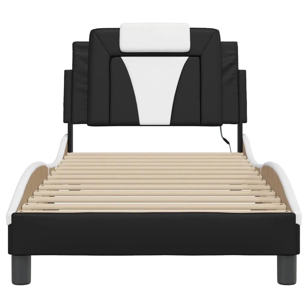 Get a better restful night's sleep from this bed frame with LED lights! It makes a welcoming addition to any bedroom. Durable faux leather: Premium faux leather is a highly durable material. It is resistant to stain, making it easy to clean with a damp cloth. The smooth surface also gives a luxurious look and the beauty of real leather.Plywood slats: The plywood slats provide good weight distribution, ensuring that the mattress stays in place with every twist and turn of your body during sleep.Excellent support: The headboard pillow is stuffed with foam for ultra-soft and optimal comfort, providing you with excellent back support while you're sitting up in bed to read or watch TV.Colourful LED strip: Bring playfulness into darkness with colourful LED lights! The hook and loop fasteners on the back of the headboard cushion can be used to secure the LED lights.Waved side design: The waved look of the bed frame is stylish and sophisticated, adding a modern and elegant touch to your decor, making it the focal point of your bedroom. Good to know:A mattress is not included with this bed. We do offer a various selection of mattresses. You can check our shop for a matching mattress.The product has a USB connector that requires a certified 5V USB power source (not included).