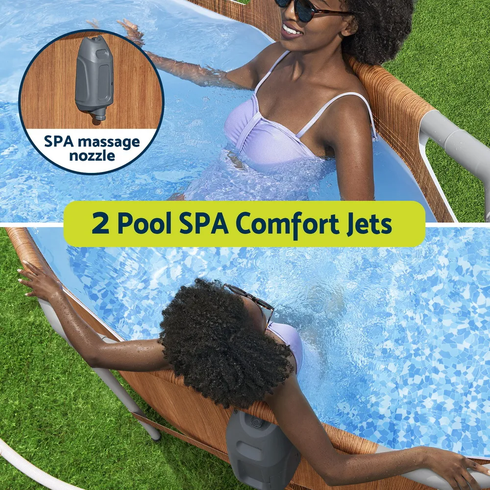 Create your own backyard oasis with this Bestway Steel Pro Max™ luxury pool & spa set! The massive 6.1m x 3.66m (20,241L) pool features 2 Comfort Jet™ massage nozzles and 7-colour LED lighting for ultimate relaxation. Built tough for Aussie conditions with rust-proof steel frame and UV-resistant Tritech™ walls. Complete kit includes powerful 2500GPH pump, ladder, filter cartridge and repair patch. Stylish brown woodgrain exterior with Santorini Tile™ interior adds premium appeal. Easy to maintain with standard hose connections. Order now for fast delivery!
