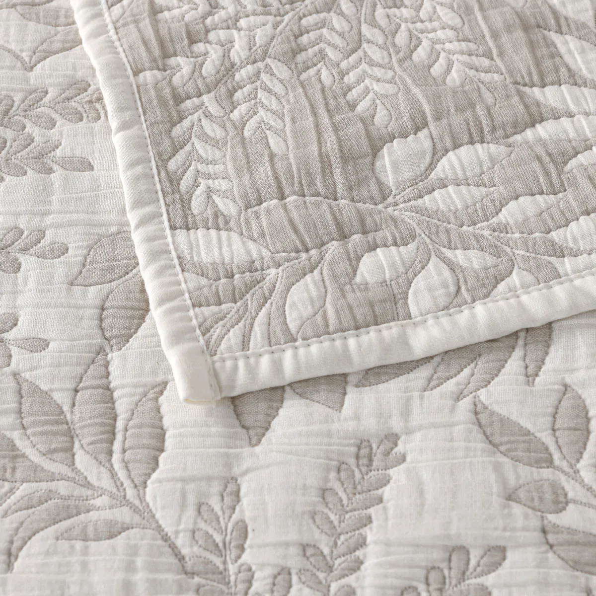 Delicate foliage in a soft stone and white colour way completely encompasses the entire bed. This stunning jacquard design pops on a crisp white background. Finished with a classy cuffed edge, Ameila Stone Jacquard Quilted Foliage Bedspread Set by Bianca is the perfect bedspread for your home. Complete the look with matching accessories.