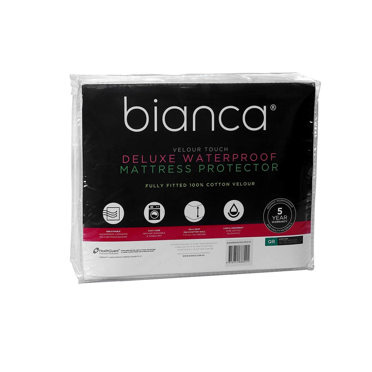 Extend the life of you mattress and pillows with Deluxe Waterproof Mattress Protector by Bianca. If features deluxe 100% cotton velour, health guard treated, anti dust mite & 50cm wall. Made from 100% cotton velour fabric, breathable, machine washable & tumble dry. Will fit any depth mattress.