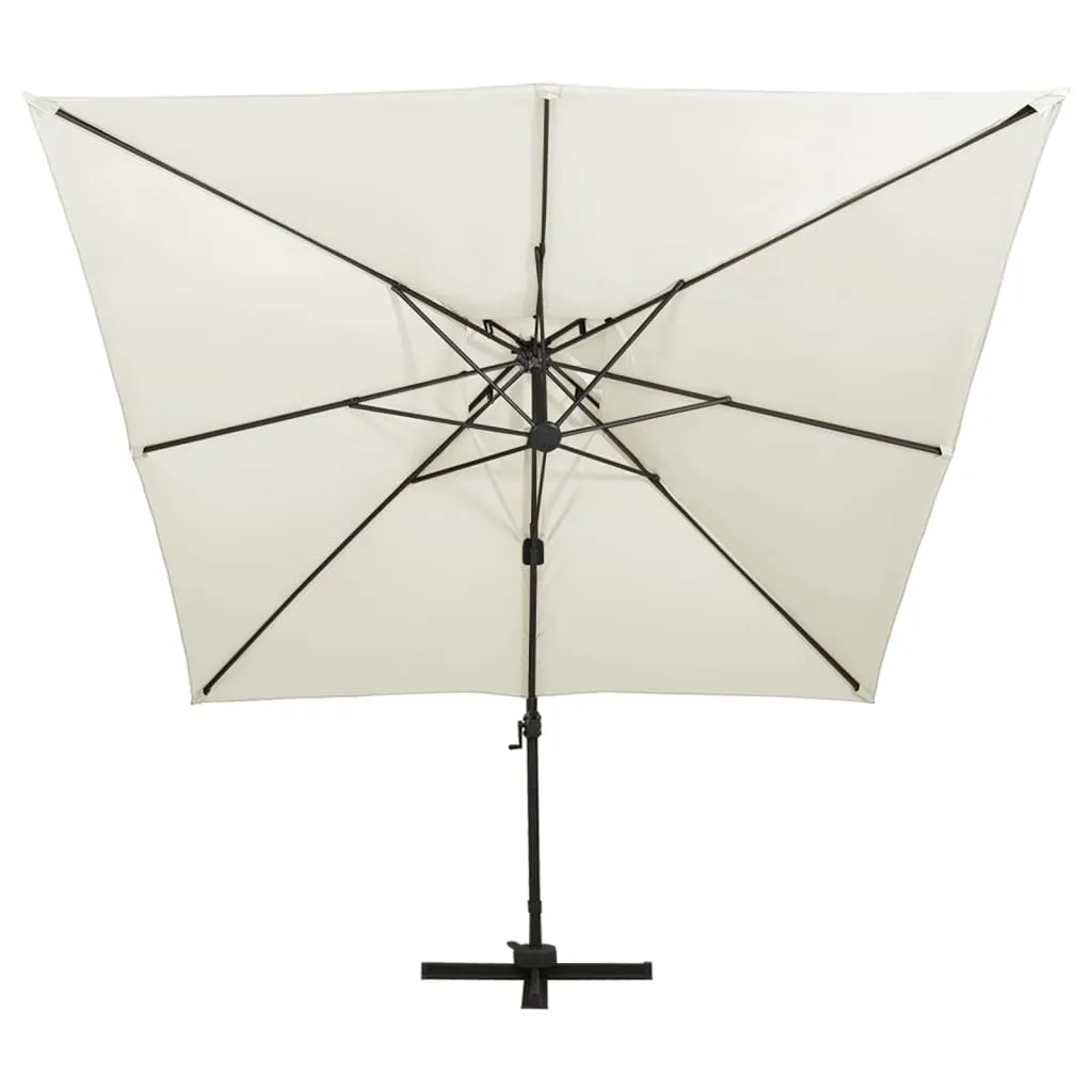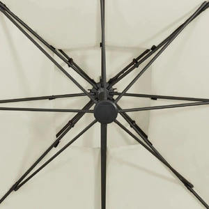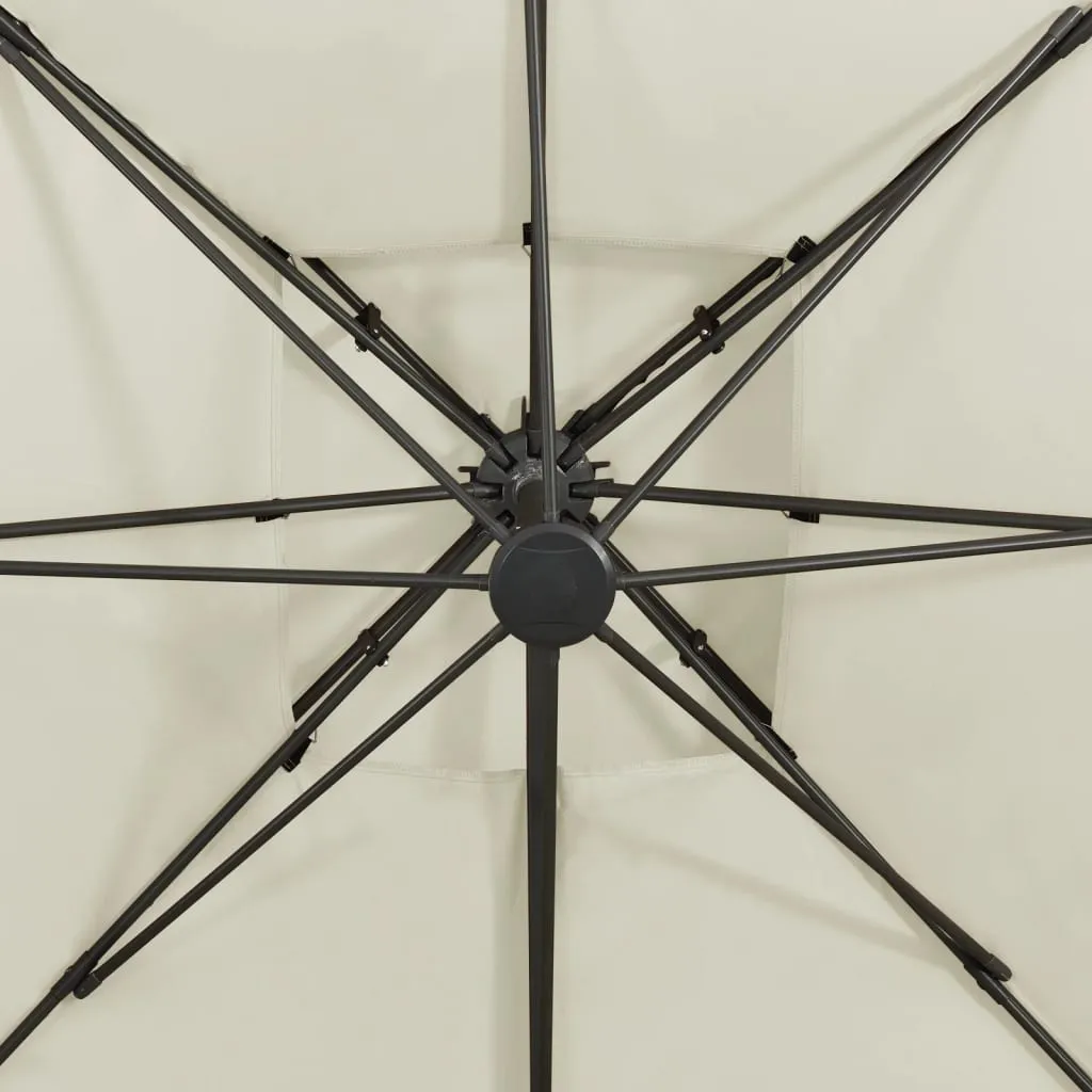 This cantilever garden parasol is perfect to create some shade and protect you from the sun's harmful UV rays. Made of UV protective and anti-fade polyester, the parasol cover provides you with optimum protection against the sun and is easy to clean. It features a sturdy cross base to add stability. The exclusive design of this parasol allows you to tilt and rotate it in 360 degrees to block the sun. The strong aluminium pole, along with the 8 ribs, makes the parasol very stable and durable. This garden umbrella can be easily opened and closed thanks to the crank mechanism. Additionally, the double-top design canopy helps ventilation. Please note that we recommend treating the umbrella fabric with a waterproofing spray if it is subjected to heavy rainfall.