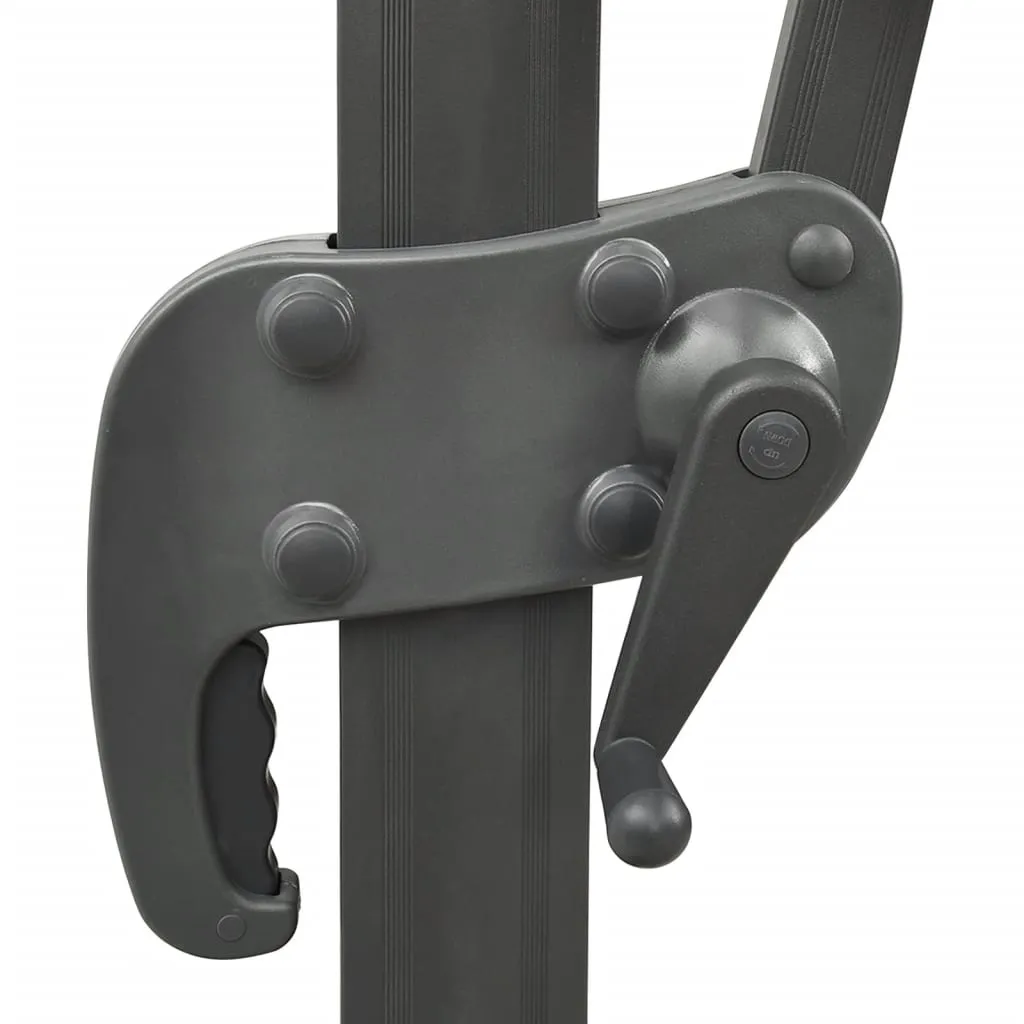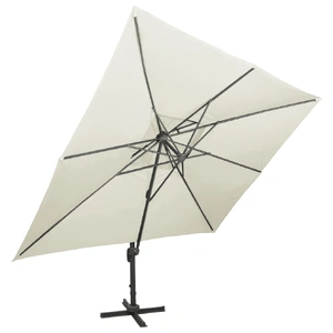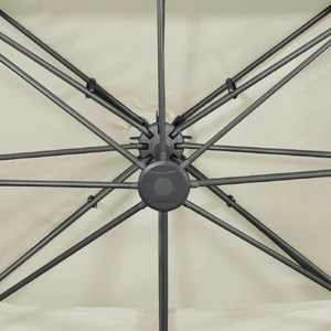 This cantilever garden parasol is perfect to create some shade and protect you from the sun's harmful UV rays. Made of UV protective and anti-fade polyester, the parasol cover provides you with optimum protection against the sun and is easy to clean. It features a sturdy cross base to add stability. The exclusive design of this parasol allows you to tilt and rotate it in 360 degrees to block the sun. The strong aluminium pole, along with the 8 ribs, makes the parasol very stable and durable. This garden umbrella can be easily opened and closed thanks to the crank mechanism. Additionally, the double-top design canopy helps ventilation. Please note that we recommend treating the umbrella fabric with a waterproofing spray if it is subjected to heavy rainfall.
