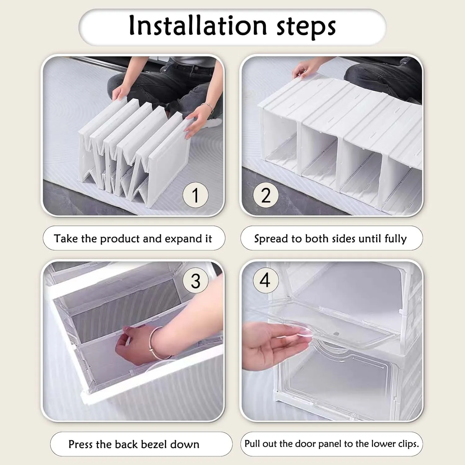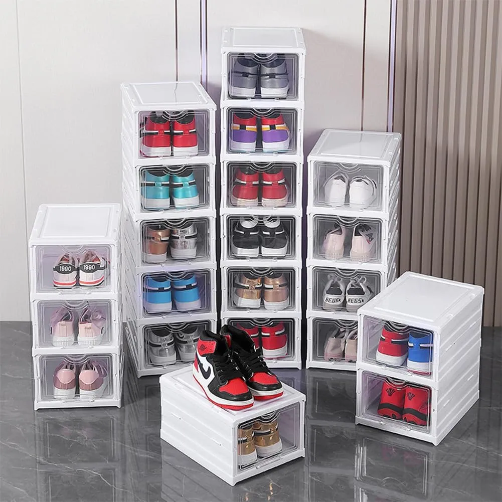 - CLEAR FRONT DOOR FOR EASY VIEWING: Each box features a transparent drop-front door, allowing you to quickly identify the pair you need without opening every box. Perfect for displaying sneakers, heels, or everyday footwear.