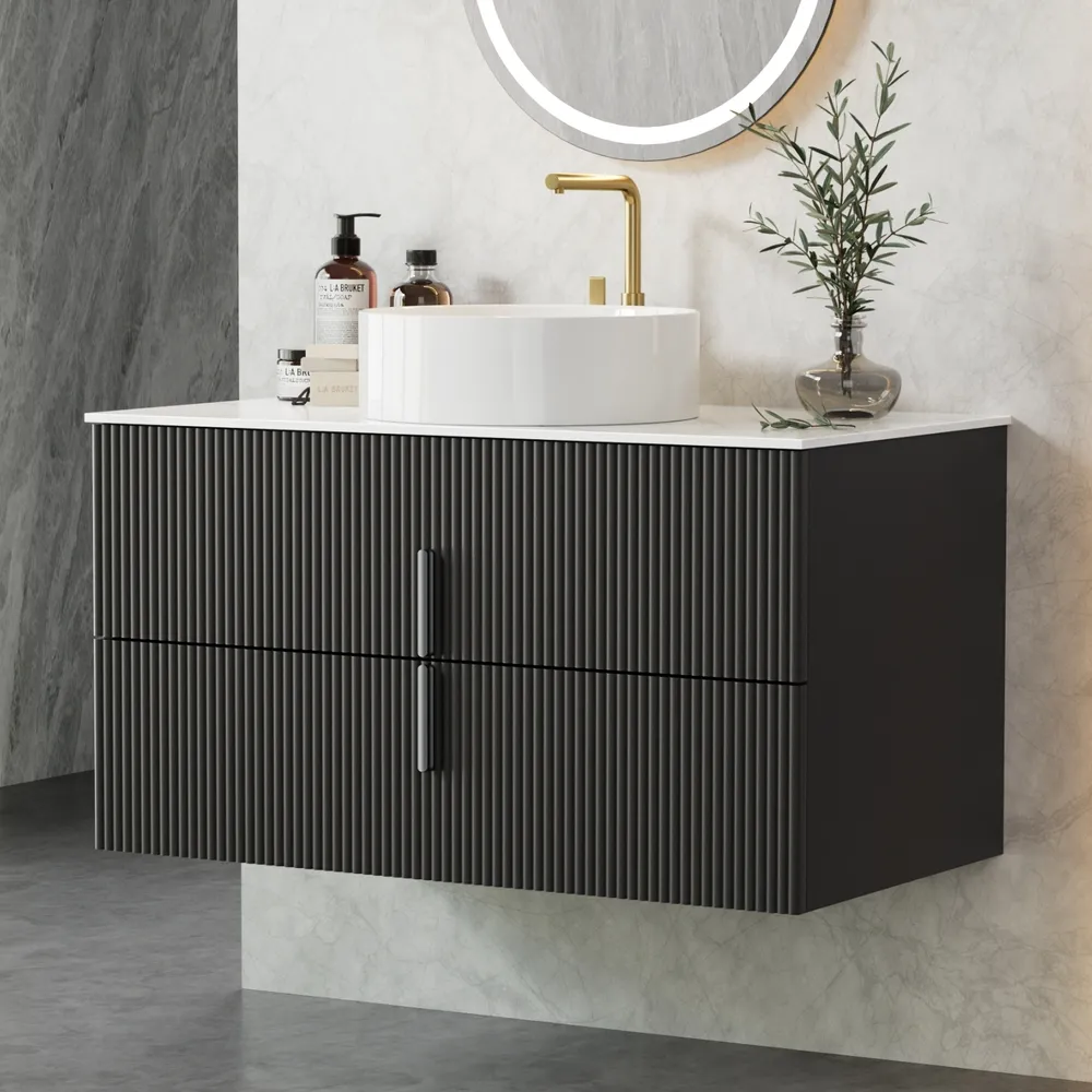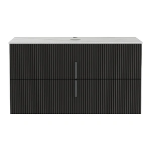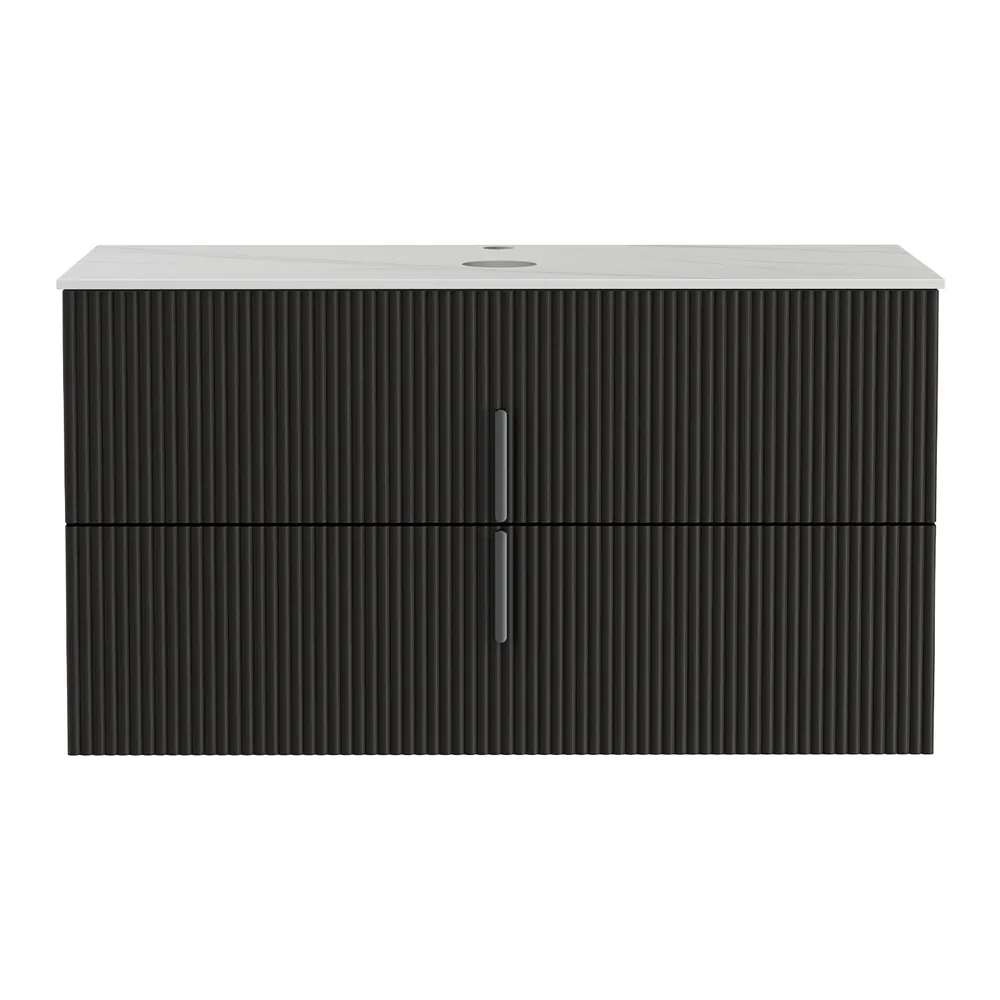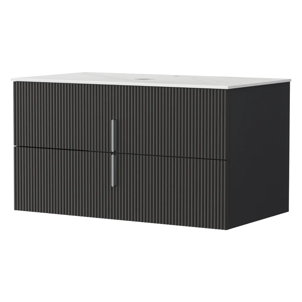 Transform your bathroom with the Cefito 900mm Black Vanity Unit, blending bold modern design and practical functionality. Perfectly sized for Australian homes, this wall-hung cabinet features a matte black soft-flute timber front, contrasted elegantly with a Carrara white engineered stone countertop for timeless appeal.
