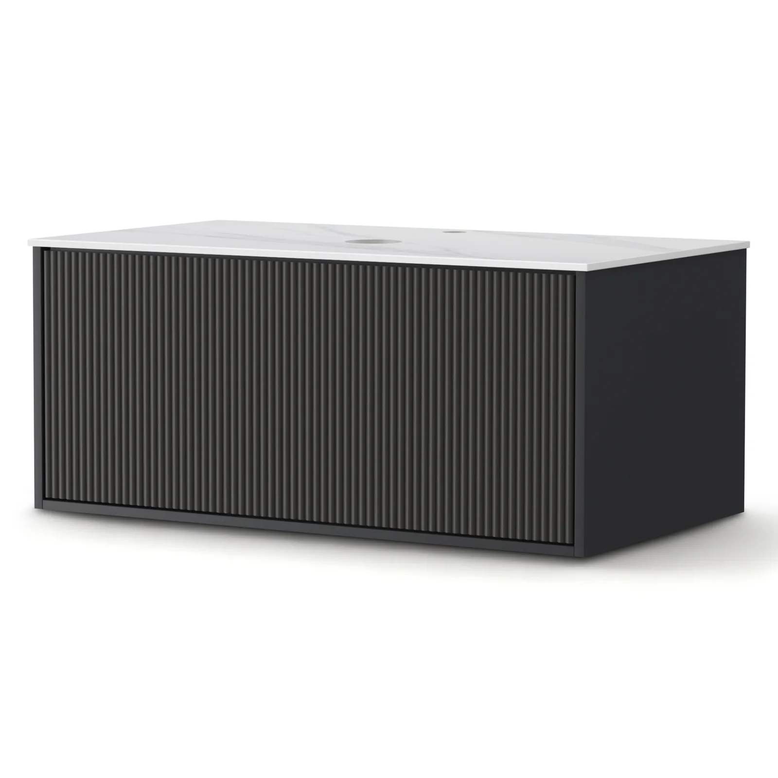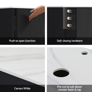 This cabinet combines modern aesthetics with maximum functionality. Featuring a durable sintered stone countertop that resists scratches and moisture, this cabinet is built to last. The handle-free soft-closing drawer adds a touch of elegance and ensures quiet operation. Constructed with quality 15mm MDF board, it offers strength and stability for daily use. Designed for easy installation, it includes a pre-drilled water outlet port and tap hole, making setup a breeze. The smooth surfaces are also easy to clean, keeping your bathroom looking pristine effortlessly. Please note, the basin is not included.