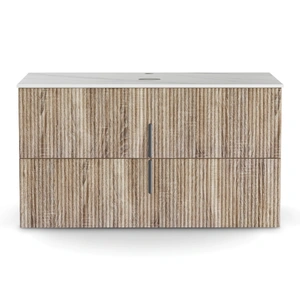 Perfectly sized for Australian homes, this wall-hung cabinet features a matte pine soft-flute timber front, contrasted elegantly with a Carrara white engineered stone countertop for timeless appeal. Crafted with moisture-resistant MDF and premium timber veneers, this unit withstands humid bathroom conditions. The Carrara white countertop resists stains and scratches, maintaining its luxe marble-inspired look with minimal upkeep. Two deep 82cm-wide drawers provide generous storage capacity, ideal for keeping bathroom essentials neatly organised. The brushed alloy handles add a refined metallic accent, while soft-closing runners ensure silent, smooth operation – no more slammed drawers! Pre-cut basin and tap holes simplify setup, compatible with most above-counter basins (sold separately). The wall-mounted design frees up floor space, enhancing cleanliness and creating an airy feel in smaller bathrooms.