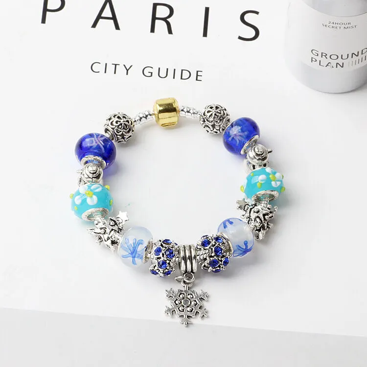 Embrace the festive charm with this Christmas-themed bracelet! Featuring adorable snowman charms, pine tree big-hole beads, and a delicate snowflake pendant, its a perfect blend of holiday spirit and stylish design. The vibrant color palette, combining bright blues, whites, and metallic tones, brings a fresh and sweet vibe, making it suitable for both men and women.
