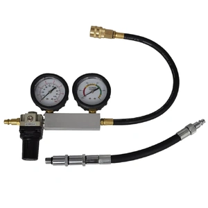 This cylinder leak detector set quickly diagnoses internal engine problems such as bad rings, valves and leaking head gaskets. The dual gauges feature metal bezel with rugged rubber protective outer boot. Input gauge scales read 0-100 psi, second (measuring) gauge measures in % leakage. This leak-down gauge reads 0 to100% leakage in 5% increments. The easy-to-read gauges are designed for proper testing and accurate results.This leak detector set is suitable for use on any petrol engine with 12or 14mm spark plugs. It can be used for almost all cars, motorcycles and trucks. All tools come in a blow molded case for easy storage and transportation. Delivery includes pressure gauge, cylinder leakage gauge, 2 x spark plug adapter, quick connect/disconnect hose and regulator.