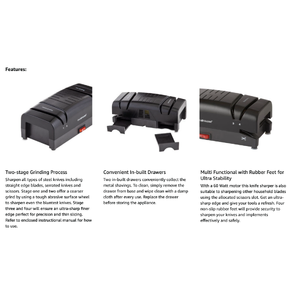 - Featuring two removable in-built drawers to collect metal shavings and dispose of conveniently, and four non-slip rubber feet to provide a stable surface to sharpen your knives safely and with ease.