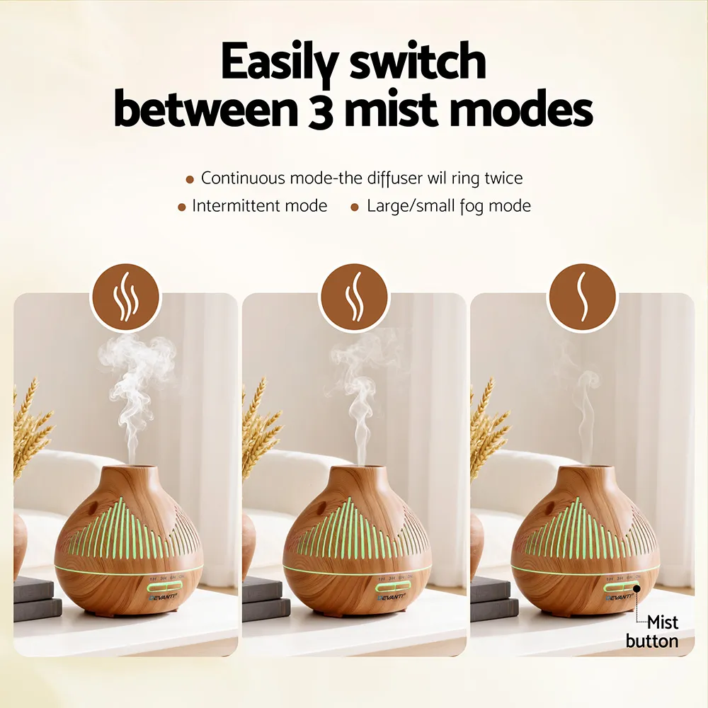 Add a touch of nature to your home with this wood grain aroma diffuser. Featuring a 400ml tank, 3 mist modes, and 3 timer settings, it creates a relaxing atmosphere with your favorite essential oils. Cycle through 7 LED colours with 2 brightness levels to set the perfect mood day or night. Whisper-quiet operation, automatic shut-off when water runs low, and low energy consumption make it safe and convenient for daily use. Perfect for bedrooms, living rooms, offices, or as a thoughtful gift.