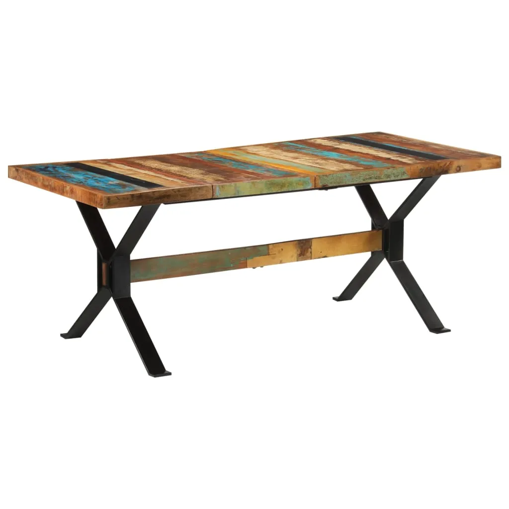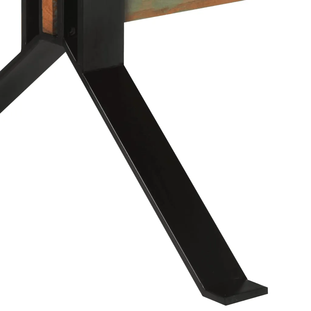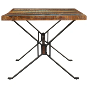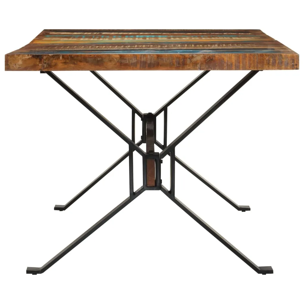 This wooden dining table features a vintage charm that will make it a distinctive addition to your living space. Solid reclaimed wood: Solid reclaimed wood consists of reused timbers such as teak, mango wood, pinewood, and beech. These materials are recycled from old buildings such as factories, sheds, and boats. As every piece is handmade, colours will vary for each product.Sturdy frame: The metal frame ensures sturdiness and stability.Practical tabletop: The sturdy tabletop of the kitchen table is perfect for placing meals, drinks, and other decorative items. Warning:To prevent it being overturned, this product must be used with the provided wall attachment device.Note:The colours may vary from piece to piece, making each piece unique and slightly different from the next. The delivery is random, ensuring the exclusivity and individuality of your product.